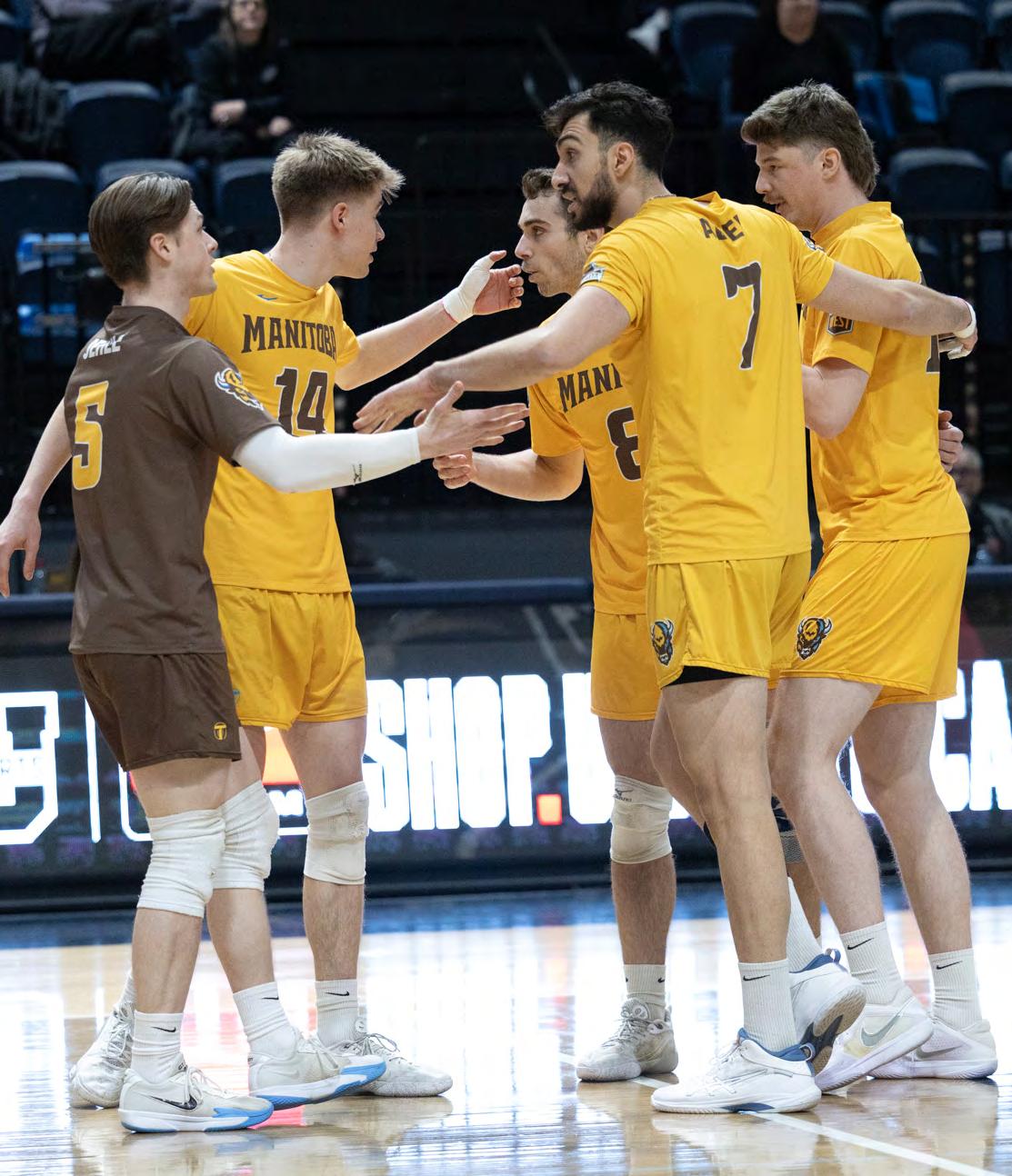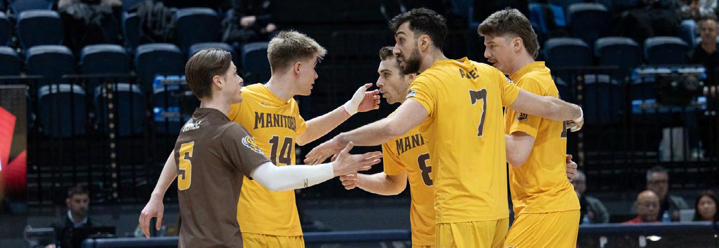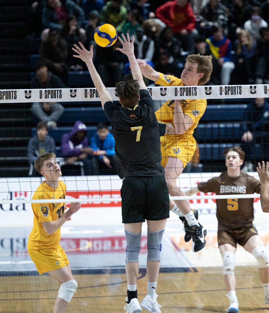 he Bisons men’s volleyball team advanced to the 2026 National Championship semifinals with a convincing 3-0 victory over Université Laval Rouge et Or on Friday, March 13. The Bisons won the match in straight sets, 25-20, 25-16 and 25-17.