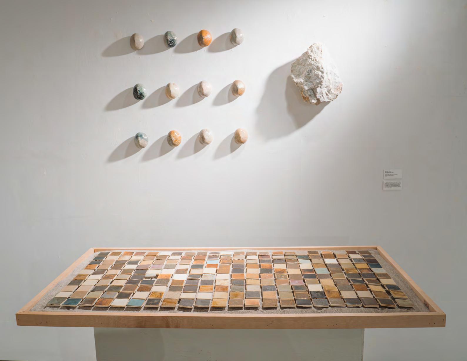 “[I brought the] pieces together with a rock mounted to the wall. The rocks themselves [are] made into ceramics,” he said. “I’ve made copies of those [rocks] to think about the connection of deep time in relation to human time, and how ceramics is recreating the rocks […] on a shorter time scale.”
