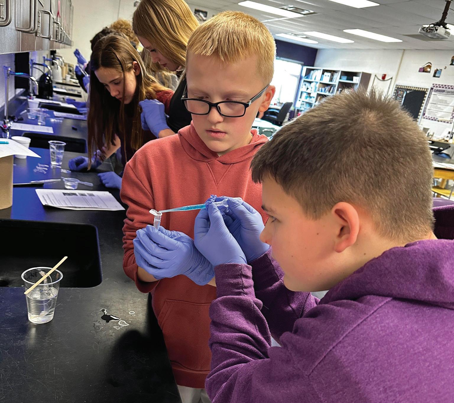 Seventh grade science students recently traded their engineering hats for doctor scrubs as they explored how different systems in the human body work together to influence how we feel. During a recent lab, students tested solutions to determine whether glucose or starch was present, gaining hands-on experience with scientific investigation and real-world applications of biology and chemistry.