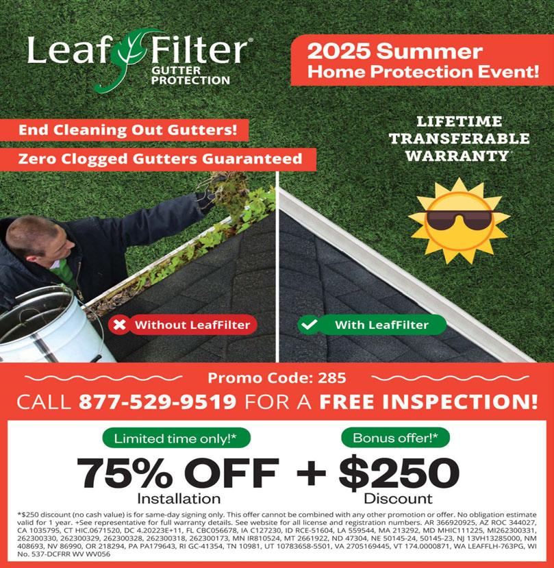 • No cleaning gutters guaranteed! LeafFilter - most ad-vanced gutter protection, backed by a no-clog guaran-tee & lifetime warranty. 833-610-1936 schedule free inspection & estimate. Get 20% off! Seniors/military save extra 10%. Restrictions apply, see rep for warran-ty & details.