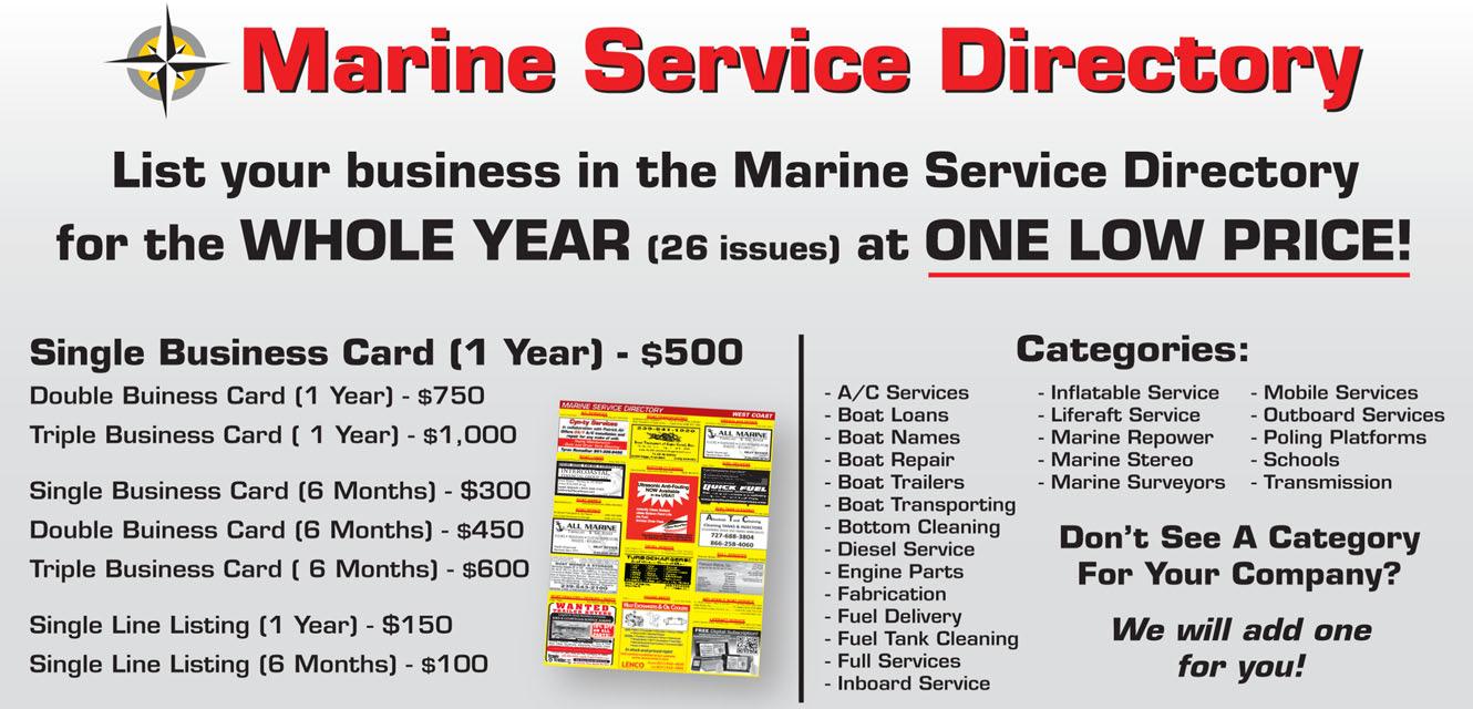48 BOAT REPAIR Molly's Marine Service ..............................................(239) 262-2628 Owl Creek Boatworks & Storage ...............................(239) 543-2100 DIESEL SERVICE Diesel Services, Inc. .......................................Cape Coral (941) 391-0836 Marine Diesel One LLC .....................................................(941) 350-5934 Ram Turbos Inc ...............................................Grassy Key (305) 743-2920 WEST COAST ELECTRICAL / ELECTRONICS Shiptronics .................................................................(239) 734-5030 Yacht Electronic Services ................(727) 639-2885; (813) 557-8971 DIESEL SERVICE CONTINUED S Complete Marine Diesel Repair and Service “Your Caterpillar Engine Specialist” Mike Muscente | 941-391-0836 | dieselservicesinc@hotmail.com DOCUMENTATION SERVICE Absolute Yacht Documentation Services...................(941) 628-1771 Compass Yacht Documentation Services, LLC ...........(727) 340-7747 Absolute Yacht Documentation Services 941-628-1771 absoluteyachtdocs@gmail.com www.absoluteyachtdocs.com AVDA Member • Broker Closings • Private Sale Closings • Escrow Acct Services Available COMPASS YACHT DOCUMENTATION SERVICES Navigating You Through a Sea of Paperwork Captain Betty Mata Yacht Documentation Specialist 727-340-7747 info@compassyachtdocs.com Go Big this holiday season Adopt-A-Manatee ®: the gift that keeps on giving! savethemanatee.org • 1-800-432-JOIN (5646) Photo ©David Schrichte