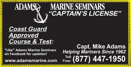 47 4 December 2022 / THE Florida MARINER #973 DIESEL SERVICE Ram Turbos Inc.............................Grassy Key (305) 743-2920 ENGINE PARTS Lenco .........................................................................(631) 842-4049 BOAT REPAIR Owl Creek Boatworks & Storage ...............................(239) 543-2100 MARINE SURVEYORS Navtech US Surveyors Association ............................(800) 245-4425 EAST COAST Become a Certified and Accredited Master Marine Surveyor Navtech US Surveyors Association 1-800-245-4425 navsurvey@aol.com Navsurvey.com SCHOOLS & INSTRUCTION Adams Marine Seminars ............................Toll-Free (877) 447-1950 Captain's License Class ..............................................(305) 849-9015 Florida Sailing & Cruising School ................Toll-Free (800) 262-7939 Sea School ..................................................Toll-Free (800) 237-8663 CRYSTAL RIVER .................JAN. 2, 2023 GAINESVILLE.....................JAN. 2, 2023 TARPON SPRINGS ...........JAN. 16, 2023 STEINHATCHEE................JAN. 23, 2023 PALM BAY / Melbourne .....FEB. 6, 2023 SANFORD ..........................FEB. 6, 2023 VENICE (day class) ......FEB. 6 - 13, 2023 MARINE INSURANCE Lauderdale Marine Underwriters, Inc. ......................(954) 678-2668 SCHOOLS & INSTRUCTION, continued