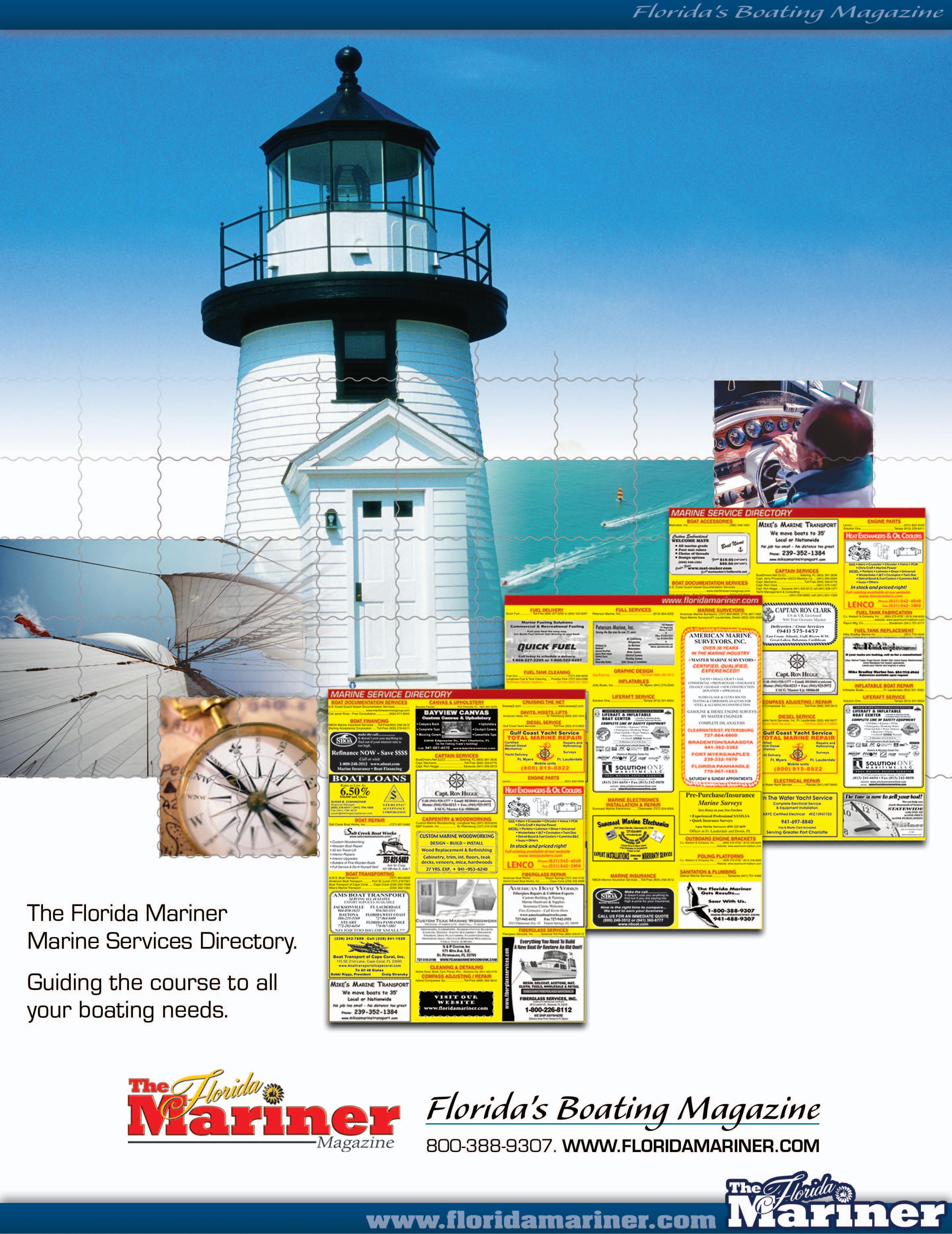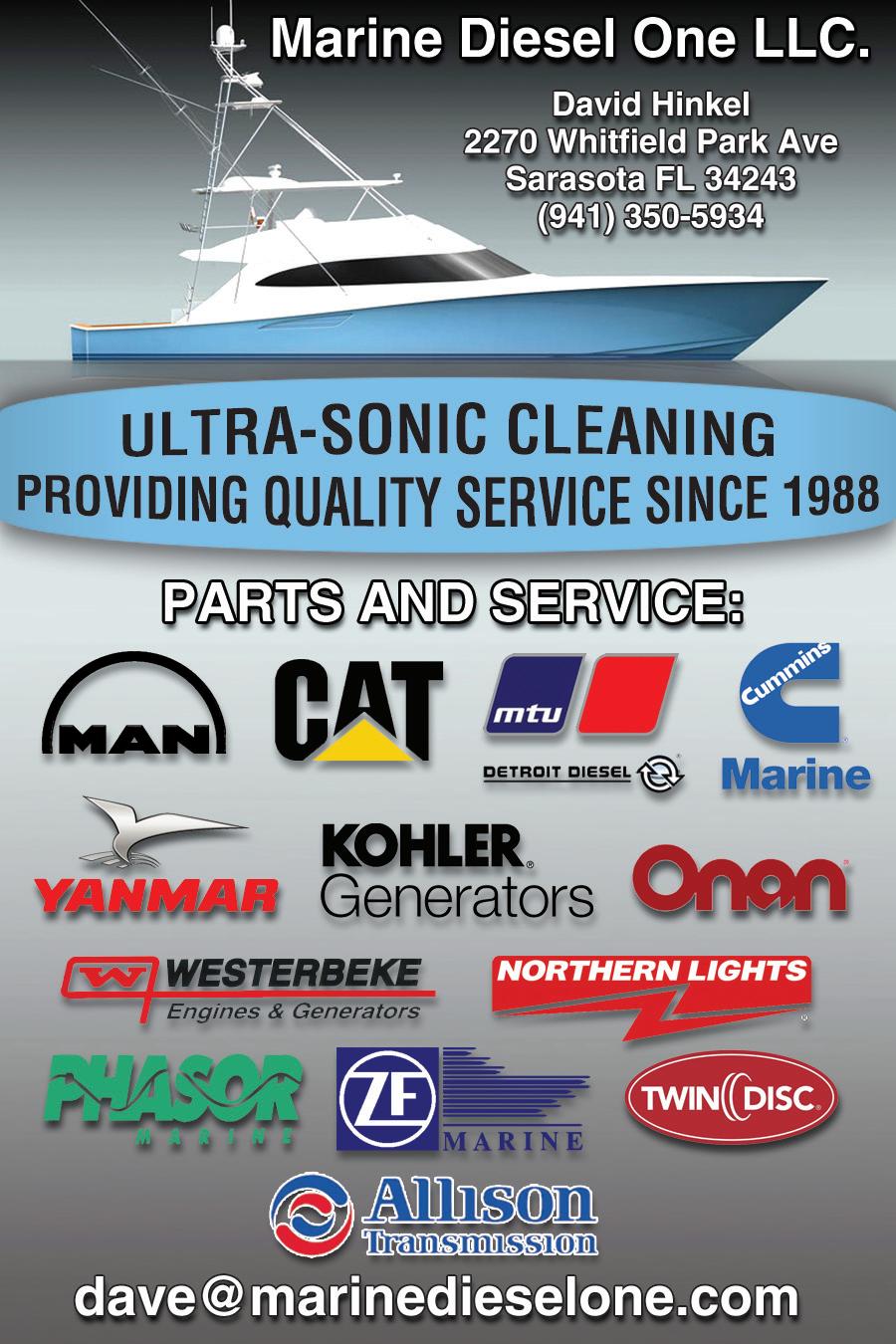 42 THE Florida MARINER #988 / 2 July 2023 DIESEL SERVICE Diesel Services, Inc. Cape Coral (941) 391-0836 Marine Diesel One LLC (941) 350-5934 Ram Turbos Inc Grassy Key (305) 743-2920 www.TheMariner.com DIESEL SERVICES of SWFL Inc. Complete Marine Diesel Repair and Service “Your Caterpillar Engine Specialist” www.DieselServicesInc.com Mike Muscente | 941-391-0836 | dieselservicesinc@hotmail.com DOCUMENTATION SERVICE Compass Yacht Documentation Services, LLC (727) 340-7747 COMPASS YACHT DOCUMENTATION SERVICES Navigating You Through a Sea of Paperwork Betty Mata Yacht Documentation Specialist 727-340-7747 info@compassyachtdocs.com ENGINE PARTS Lenco (631) 842-4049 MARINE SURVEYORS Navtech US Surveyors Association (800) 245-4425 Become a Certified and Accredited Master Marine Surveyor Navtech US Surveyors Association 1-800-245-4425 navsurvey@aol.com Navsurvey.com MARINE INSURANCE Lauderdale Marine Underwriters, Inc. (954) 678-2668 MAINTENANCE & CARE PRODUCTS YACHTEX Amazon & Marine Surplus, Sarasota, FL YACHTEX YACHTEX since 2OOO PROFESSIONAL BOAT | RV MAINTENANCE AND CARE PRODUCTS “Carnuba BluTM Liquid wax is by far the Best wax I have ever used” ~ Dan Tasedan, owner of Gulf Coast Detailing Available at: Amazon - Search Yachtex Marine Surplus - 7070 15th St. E., Sarasota, FL 34243 MARINE SERVICE & REPOWER Southeastern Marine Power St. Petersburg (727) 545-2700 SANFORD JUL. 10, 2023 TAMPA / BRANDON ................. JUL. 10, 2023 CRYSTAL RIVER - 8 DAY CLASS JUL. 31, 2023 BRADENTON JUL. 31, 2023 CLEARWATER AUG. 21, 2023 SCHOOLS & INSTRUCTION Adams Marine Seminars Toll-Free (877) 447-1950 Captain's License Class (305) 849-9015 Sea School Toll-Free (800) 237-8663 YACHT RELOCATION / DELIVERY CaptainMyCaptain (407) 756-9798 Yacht Relocation and Delivery Service Worldwide, Oceans, Sea, ICW, Bays, Rivers ALL MASTER CAPTAIN STAFF Captain/Skipper Services Yacht and Boating Instructions Yacht Management and Consulting Worry Free Hurricane Planning Over the Road Transports CaptainMyCaptain MAIN OFFICE 407-756-9798 e-mail: captjackjones@aol.com web: www.captmycapt.com UNDERWATER BOAT MAINTENANCE Monnerat Divers (954) 226-1906 / (954) 867-4502 BROWARD - PALM BEACH - DADE (954) 226-1906 / (954) 867-4502 monnerat.divers monneratboatservice@gmail.com Fort Lauderdale, FL 33305 Boat Maintenance Underwater: • Cleaning Services • Cavitation Cleaning • Hull Inspection • Zinc Replacement • Propeller Replacement Lucas Monnerat