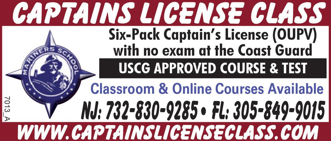of 10 horsepower or greater unless such person has in his or her possession, aboard the vessel, photographic identification, a Florida boater safety identification card (or any other state’s boating card), and the registration for their vessel. Regarding the above law, which has been in effect for over a year, Flotilla 82 of the USCG Auxiliary, based in Sarasota, Florida (at Mote Marine) offers a 1-day course held on the last Saturday of each month. It starts at 9:00 am and completes at 5:00 pm. The course includes the USCG exam which, if passed, results in a Florida lifetime boating card/license. The cost for materials is $40 for the first member of a family and $10 each per additional family member. For more information, please call C. William Myers, Public Education, Flotilla 82, at 941-388-1033. Mention you saw this announcement in the Florida Mariner, and receive 20% off!
