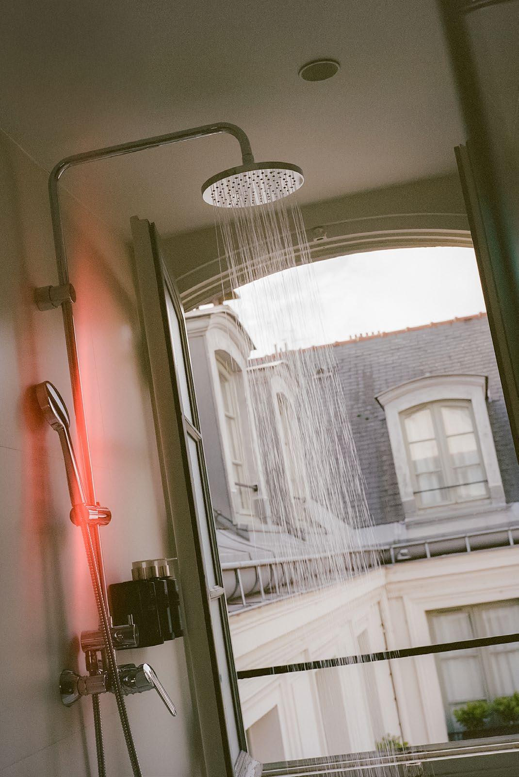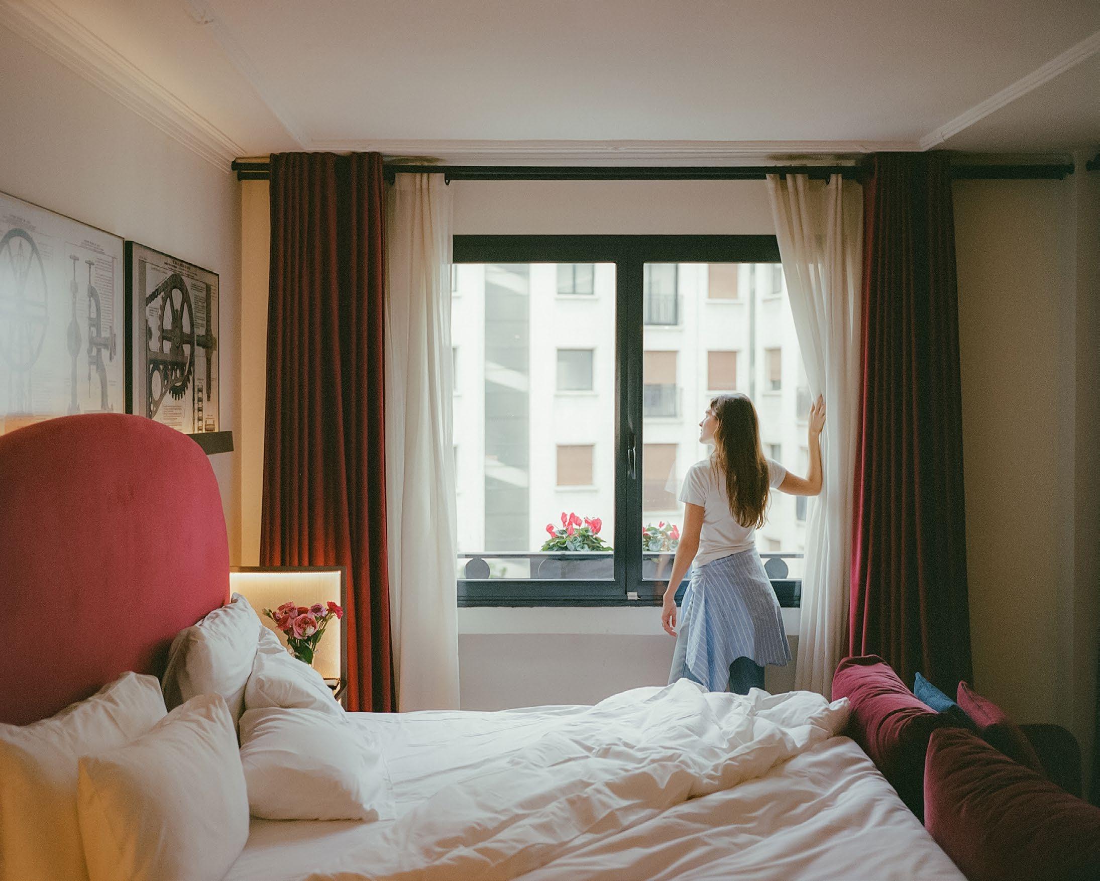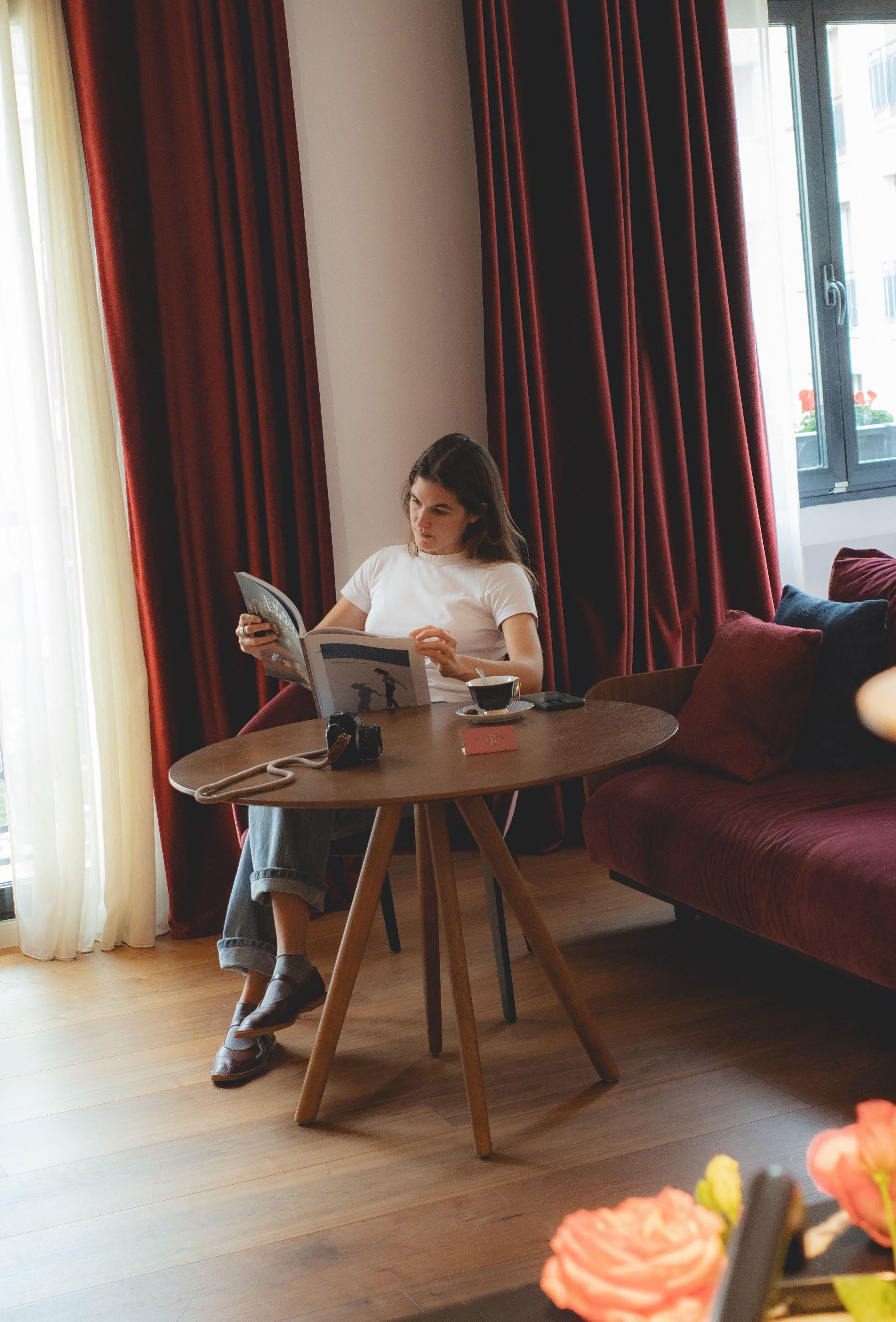 Inside, the hotel reflects this balance between history and contemporary design. Spaces are shaped by Art Deco influences, and the rooms and suites, designed by Álvaro Sans, recall the warmth of Parisian interiors through industrial touches and soft reddish tones. Some overlook the Eiffel Tower, a reminder of how central yet peaceful this neighbourhood is.