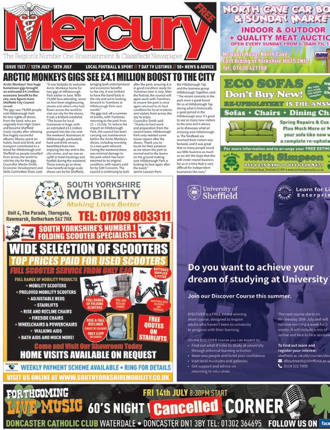 VISIT uS ONLINE AT www.SOuTHYORkSHIREmOBILITY.CO.uk Come and Visit Our Showroom Today HOmE VISITS AVAILABLE ON REquEST wIDE SELECTION OF SCOOTERS TOP PRICES PAID FOR uSED SCOOTERS FREE quOTES ON STAIRLIFTS AdjustAbledeliveredbeds And instAlled FULL RANGE OF MOBILITY PRODUCTS • MOBILITY SCOOTERS • PRELOVED MOBILITY SCOOTERS • ADjUSTABLE BEDS • STAIRLIFTS • RISE AND RECLINE ChAIRS • FIRESIDE ChAIRS • WhEELChAIRS & POWERChAIRS • WALkING AIDS • BATh AIDS AND MUCh MORE! WEEKLY PAYMENT SCHEME AVAILABLE • RING FOR DETAILS Unit 4, The Parade, Thorogate, Rawmarsh, Rotherham S62 7hX TEL: 01709 803311 rise And recline chAirs SOuTH YORkSHIRE’S NumBER 1 FOLDING SCOOTER SPECIALISTS FULL RANGE OF FOLDING SCOOTERS BATTERIES SUPPLIED & FITTED FuLL SCOOTER SERVICE FROm ONLY £40 RISE & FALL RECLINER CHOICE OF COLOURS ONLY £699 DELIVERED THE ONLY WAY IS S6 SPECIAL GUIDE TO BUSINESSES IN HILLSBOROUGH & BEYOND PAGES 13-17 THE ONLY WAY IS S6 SPECIAL GUIDE TO BUSINESSES IN HILLSBOROUGH & BEYOND PAGES 13-17