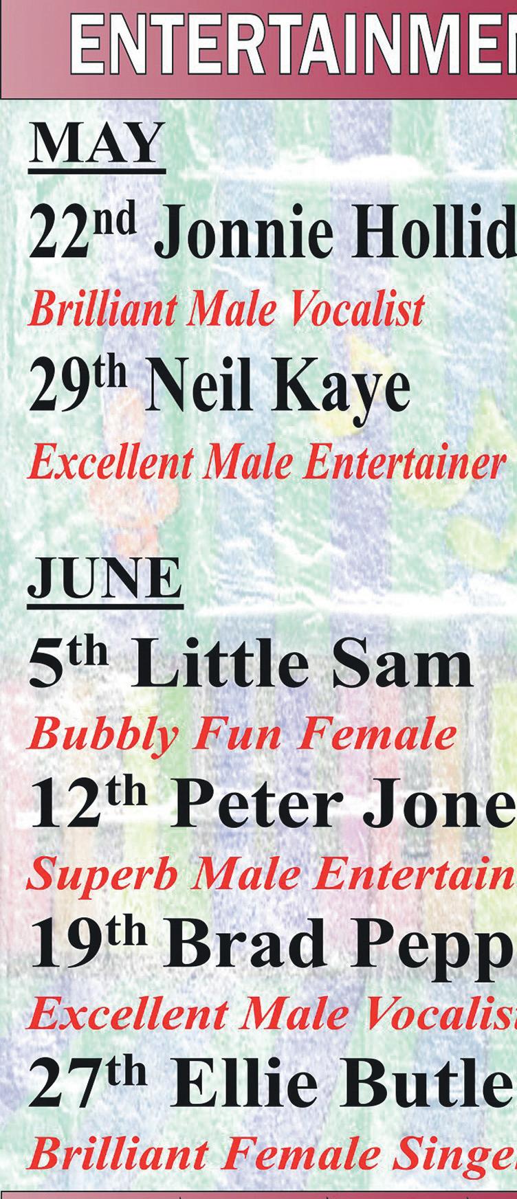 DONCASTER CAThOLIC CLUB WATERDALE • DONCASTER DN1 3BY TEL: 01302 364695 FOLLOW US ON FORTHCOMING LIVE MUSIC FORTHCOMING LIVE MUSIC FRIDAY 29Th SEPT RESURRECTION playing timeless rock classics TUE 19Th SEPT DAMION LIVE 60s AFTERNOONS LIVE 60s AFTERNOONS NEW MONTHLY ROCK NIGHT JUST £3 ENTRY NEW MONTHLY ROCK NIGHT JUST £3 ENTRY lescar lane sharrow s11 8qx Telephone: 0114 698 3545 www.peakssportsbar.com open: Mon 5pM-11pM / Tues-Thurs 11 -11pM / saT 11aM -MIDnIGhT / sun 11aM -11pM • Full size snooker Tables • american pool Tables • english pool Tables • nine Dart Boards • Beer Garden • First class restaurant • rooms for corporate events sTuDenT DIscounT MonDay - ThursDay 15% HAvIng A PARTy? EnquIRE AbouT ouR FunCTIon RooM THAT CAn CATER FoR uP To 50 guESTS! sporTs Bar & snooKer cluB FREE MEMBERSHIP WITH THIS ADVERT