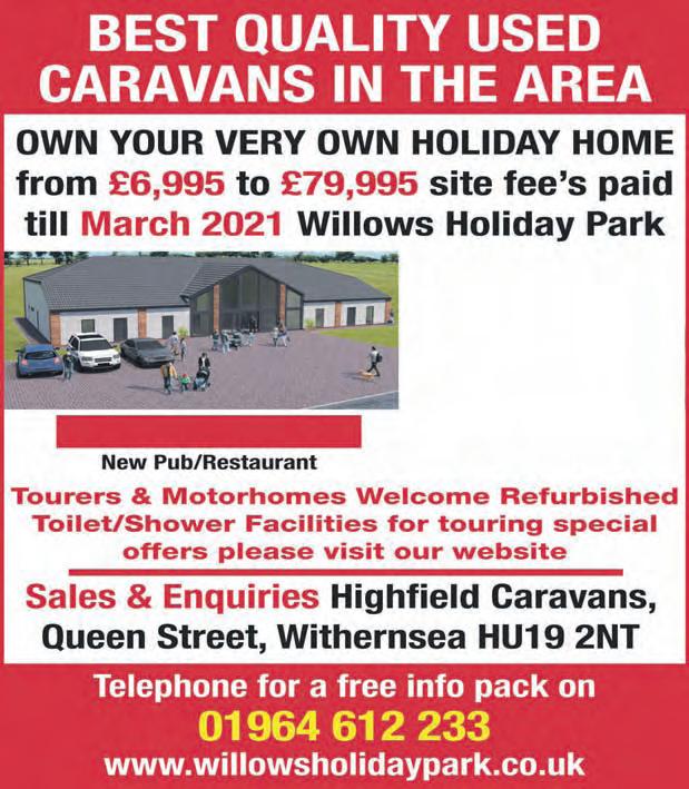 To Advertise your Hotel, B&B, Caravan, Holiday Park and more call our sales team on 0114 276 3633 EAST COAST MERCURYH LIDAYS In a tranquil setting with walks to the beach. The ultimate mix of style & exclusivity, between Scarborough & Whitby. Luxury Log Houses AVAILABLE TO RENT TEL: 01723 870574 • www.lowfieldloghouses.co.uk YORKSHIRE’S HIDDEN GEM www.willowsholidaypark.co.uk SPECIAL OFFER ONLY £25, 995 WITH SITE FEES PAID TO MARCH 2024 Lovely Holiday Home with 1 Bedroom, Double Glazing & Central Heating We also have other caravans for sale from only £6995 or for further info visit us online at: 01964 612233 Mobile: 07824 811616 PRE-OWNED WILLERBY VOGuE 37ft x 12ft 1 BEDROOM HOLIDAY PARKS The North’s largest entertainment weekly • Call our sales team to get your advert on these pages on 0114 276 3633 opt.1 • 19 The Mercury Newspaper • www.mercurynewspaper.co.uk SKEGNESS Fully Equipped seafront holiday flats, sleeps 2-6, some with sea views, all flats with en-suite facilities, free offroad parking, LCD TV/DVD player, various dates available. Ground Floor Available, Well behaved pets allowed. FREE WI-FI www.newnesholidayflats.co.uk TELEPHONE 01754 880852 WEEKS FROM ONLY £210 Mobile: 07913642887 or 07799535414 FISHING HOLIDAYS FISHING IN THE FENS FISHING IN THE FENS All Anglers Welcome to THE CONIFERS GUESTHOUSE • Bed & Breakfast • Flask filled FREE • Packed Lunch Optional NEAR MANY DRAINS AND CARP LAKES Tackle Shop nearby • Free Car Park Contact Jackie Smith on 01733 203256 / 07967 331704 www.conifers-guesthouse.co.uk £35 BED & BREAKFAST THE OLD MILL CARAVAN PARK NO dOGS adults only A-LEvEL immaculate SMALL FAMILY-RUN SITE SET IN RURAL EAST YORKSHIRE CALL 01262 673 565 WWW OLdMILLCARAvANPARK CO UK The Old Mill Caravan Park, Newsham Hill Lane, Bempton, Near Bridlington, E. Yorks YO16 6XE TOURERS £30.00 PER NIGHT Including Electric SEASONAL £1725 Including Storage Mobile: 07824 811616 now open! March 2024 Hollym Road, withernsea HU19 2pn willows Holiday park CAMELOT HOTEL CAMELOT HOTEL HORNBY ROAD • BLACKPOOL SPECIAL OFFER! MON - FRI BB £120 PER PERSON WEEKENdS AvAILABLE - CALL FOR dETAILS FREE ON SITE PARKING vISIT US ONLINE AT WWW.CAMELOTHOTEL.NET TEL 01253 620518 THIS HOTEL IS PERFECTLY LOCATEd FOR ALL THE ATTRACTIONS, HIGHLY RECOMMENdEd EAST COAST BRIDLINGTON fOuR supeRIOR hOLIDay COTTaGes south shore holiday Village pLease CaLL BILL ON 07714 154450 ChaLeT Three Bedrooms - Two Bathrooms Self Catering Sleep 2-6 To View Online Visit cchbridlington.com Central Location Self Catering Sleep 2-6 pLease CaLL 07576 057952 bLACKPOOL