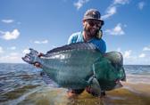 I thought, “Na, can’t be...” but I kept my eye on things as the bluebottle got closer and closer to the bats. When it was within five metres of the bats all three of them charged like mad animals fighting for a piece of scrap meat. The biggest batfish got there first and slurped it down sticking its whole head out the water, eyes and all. I was shocked but still thinking it might have been a fluke. It was now almost home time and my guest said we could all catch a few bones before we head back as the GTs were nowhere to be seen. Nine-weight in hand I was walking back to fetch the boat when I saw another bluebottle drifting past. This time I wanted solid proof. I took my bonefish fly and gently hooked the bluebottle and let it drift with my fly in it. Some would call it live baiting. A bat raced out of nowhere and, off the surface, inhaled the bluebottle with my fly and I was on! All I remember saying to James and my guest, before losing the batfish shortly afterwards, was, “Batfish on surface flies, James! Fucking batfish on top water bru!”