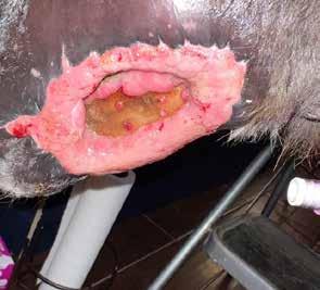 Given the extensive damage and type of injury, wound management was focused on supporting healing by second intention.