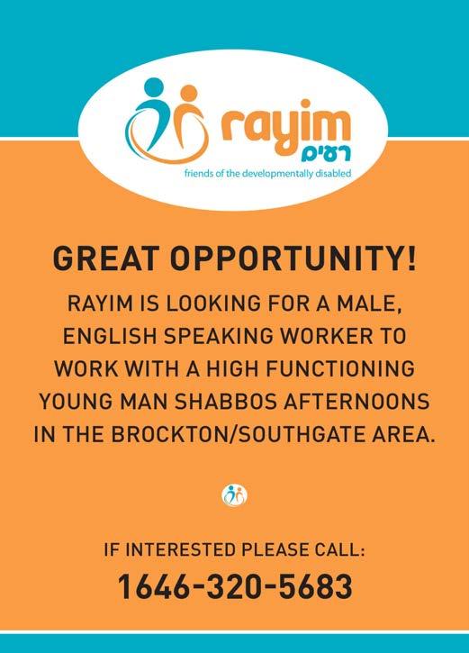 See our ad inside! Call us to schedule the build and takedown of your sukkah. A professional and reliable company. Momo: (845) 300-8538 Dovid: (718) 541-8983