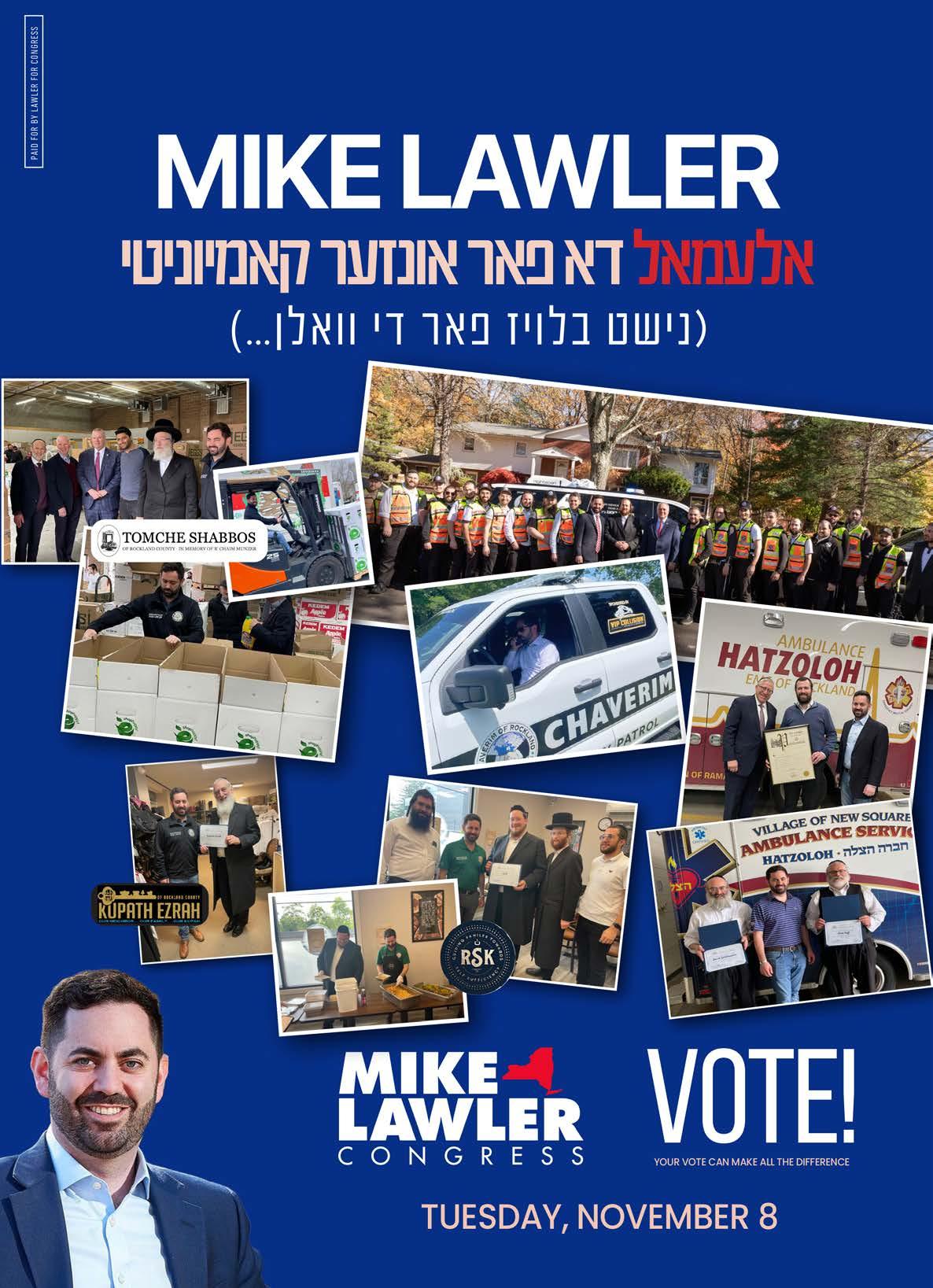 Assemblyman Lawler is a close friend of the Jewish community in Monsey. In the last two years, he has forged close relationships with the Monsey population, where he is very popular, and with community activists, mosdos, and organizations. Thou sands of Monsey residents are expected to participate in the election, which a united Jewish vote will largely determine.
