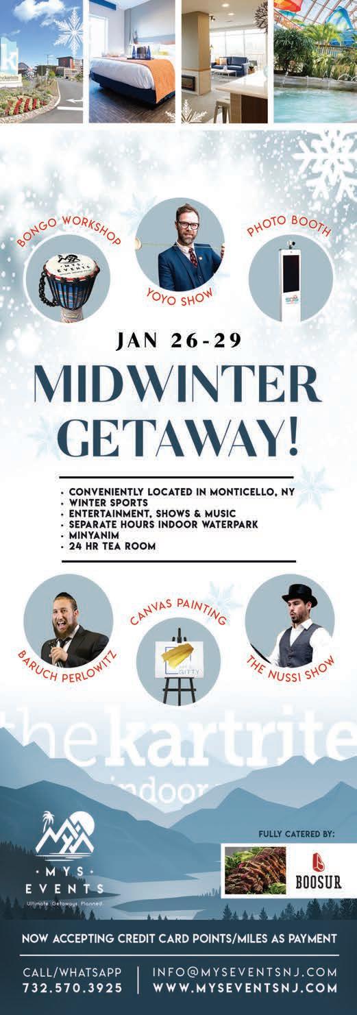 MONSEY, NY WEATHER FORECAST THURSDAY 49°/37° 80% FRIDAY 42°/31° 83% MONDAY 34°/18° 49% SHABBOS 40°/20° 13% TUESDAY 33°/20° 0% SUNDAY 31°/22° 46% WEDNESDAY 35°/23° 1% The Everest Equity Company, Inc. Registered Mortgage Broker New York State Department of Financial Services. Mortgage Broker Licensed by the New Jersey Department of Banking and Insurance. Licensed Mortgage Broker CT, PA, FL and NC Banking Departments. Loans arranged through third party providers. Company NMLS ID 12484 8 4 5 3 5 7 6 9 0 0 • n f o @ e v e r e s t e q u t y c o m • e v e r e s t e q u t y c o m 2 E X E C U T V E B L V D S U T E 2 0 1 • S U F F E R N , N Y 1 0 9 0 1 110 www.themonseyview.com 845.600.8484 The Monsey View January 4, 2023