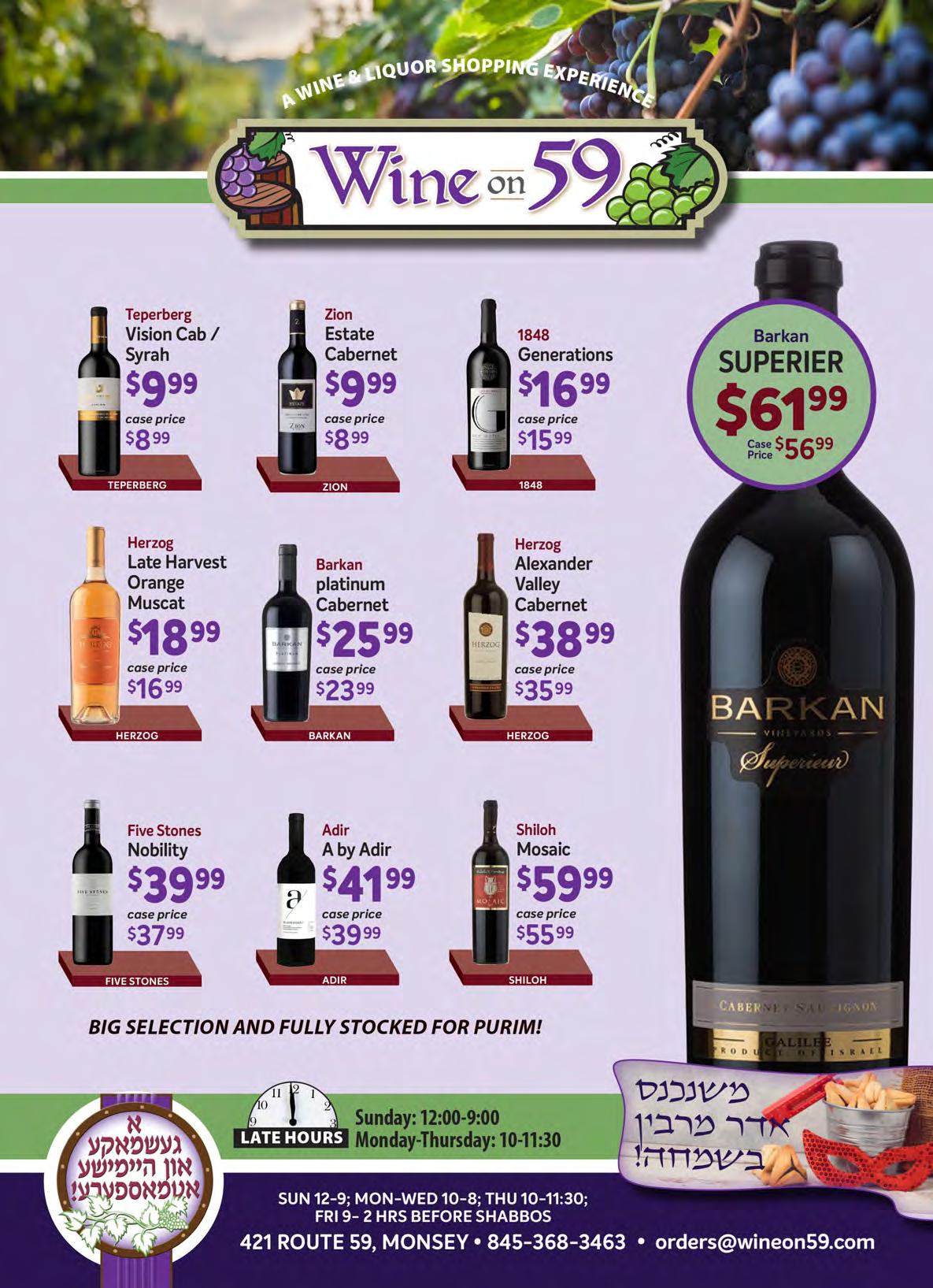 Teperberg Impression $15.99 Teperberg Inspire $19.99 1848 2nd Gen Cab $19.99 Barkan Gold $15.99 Herzog Be Leaf $19.99 Lueria Cab $32.99 Barkan Platinum $24.99 Psagot Sinai $19.99 Carmel Private Cab $12.99 Tepeberg Vision $9.99 Special for Purim… BIG SELECTION OF MINI LIQUORS STARTING AT 0.59 CENTS Walders $9.99 Bartenura 375 ml $7.99 Bartenura 4 Pack $12.99 Lavie Liqueur $7.99 All flavors Rambam 375 ml $6.99 Rambam 4 Pack $9.99 Zion Estate Cabernet $10.99 $18.99 by the case$8.99 by the case $18.99 by the case $31.99 by the case $18.99 by the case$11.99 by the case $23.99 by the case $18.99 by the case $9.99 by the case $14.99 by the case $14.99 by the case BEAUTIFUL READY תונמ חולשמ