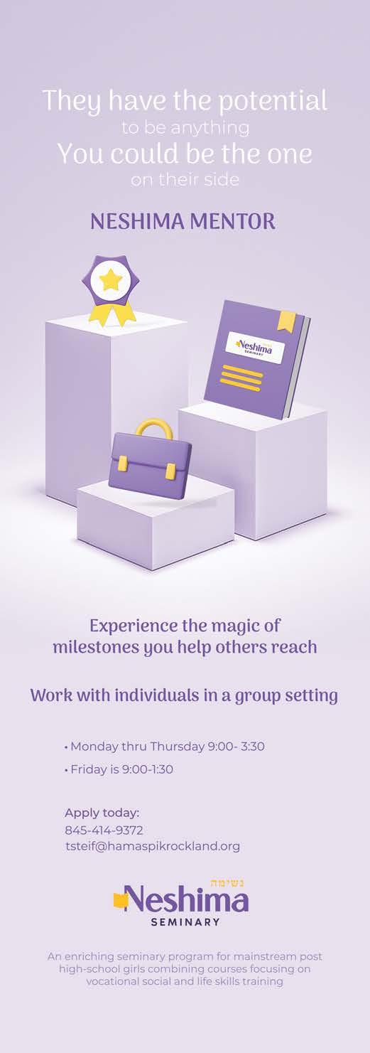 MONSEY, NY WEATHER FORECAST THURSDAY 51°/30° 60% FRIDAY 38°/30° 89% MONDAY 37°/23° 0% SHABBOS 42°/20° 25% TUESDAY 38°/19° 55% SUNDAY 34°/22° 0% WEDNESDAY 34°/18° 4% The Everest Equity Company, Inc. Registered Mortgage Broker New York State Department of Financial Services. Mortgage Broker Licensed by the New Jersey Department of Banking and Insurance. Licensed Mortgage Broker CT, PA, FL and NC Banking Departments. Loans arranged through third party providers. Company NMLS ID 12484 8 4 5 3 5 7 6 9 0 0 • n f o @ e v e r e s t e q u t y c o m • e v e r e s t e q u t y c o m 2 E X E C U T V E B L V D S U T E 2 0 1 • S U F F E R N , N Y 1 0 9 0 1 168 www.themonseyview.com 845.600.8484 The Monsey View March 1, 2023
