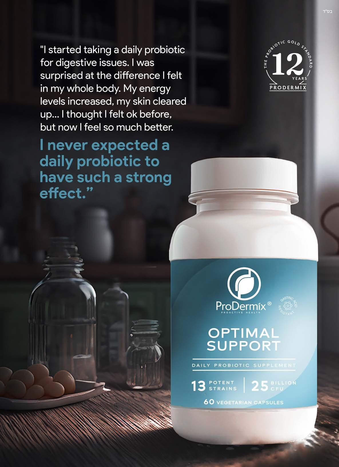 The company constantly receives feedback from yet another category: those who manage fine during the week, but struggle with unpleasant digestive issues over Shabbos, Yom Tov, and simchas. “I suffered from a ‘Shabbos hangover’ every week,” says one typical ProDermix customer. “The bigger meals, and the mitzvah of eating three seudos plus washing for a late Melava Malka, left me feeling terrible every single Sunday. I couldn’t schedule anything for Sunday because I always felt so sick. Since I started on Optimal Support, it’s all gone. My digestion is doing just fine, even after a little cholent and kugel, and I don’t get sick. I can get up on Sunday and have a regular day.”