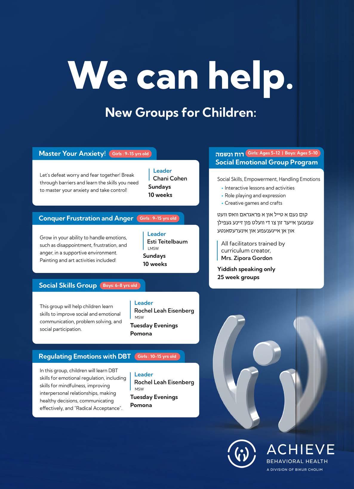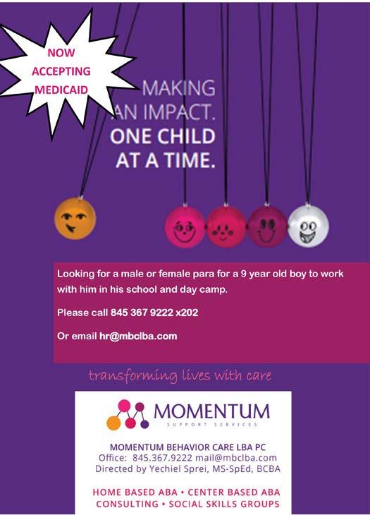 Remove fears, anxiety, sleeplessness, constipation, allergies, asthma, bedwetting, improve self esteem. Quick and effective, all ages. Experienced male and female therapists available. Children’s specialist on board. Endorsed by Rabbonim. Call Mrs. Yuhanan 845-825-9342.