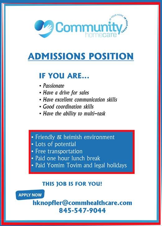 Accepting applications for call center and billing associate positions! RefuahHealth is HIRING! #LoveMyWork START HERE TODAY AND EXPAND YOUR POTENTIAL FOR TOMORROW. Choose us and you’ll get: FLEXIBLE SCHEDULES STIMULATING WORK GREAT COMPENSATION ATTENTION POST HIGH SCHOOL AND SEMINARY GIRLS 728 N. Main St. Spring Valley, NY 845.354.9300 | refuahhealth.org JOIN OUR TEAM! APPLY TODAY! Send your resume to careers@refuahhealth.org