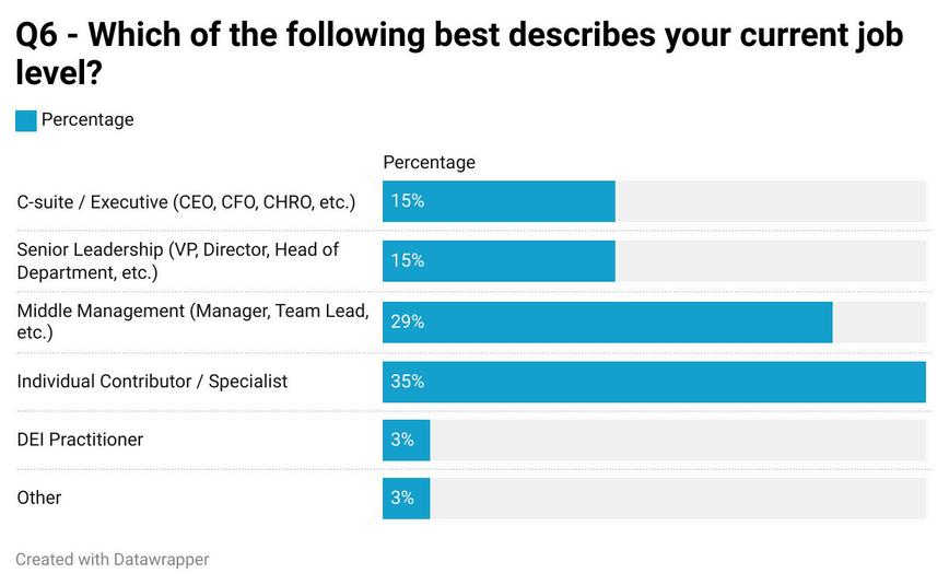 The majority of respondents were from Australia, accounting for 82% of the total responses. The survey captured a broad representation of job levels, with the largest proportion being individual contributors at 35%, followed by middle managers at 29% This diverse range of job levels provides a comprehensive view of the DEIB landscape across different professional experiences.