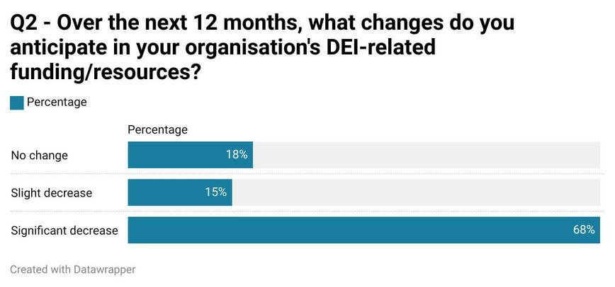 This reflects a trend where organisations are not only reducing DEI resources but also cutting back on communication and outreach, potentially diminishing the visibility and impact of their DEI work