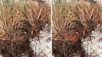 Figure2.Tournotarisbimaculata Fabrisiuslar vaefeedingamongstroots of crownretrievedfrom acommercialfield of creeping redfescuegrowing nearSilver ValleyABonOctober17,2023.Photo:AAFC-Beaverlodge-S Dufton.Note:Redrings overlaidonrightimagehighlightindividualinsitu lar vae.