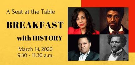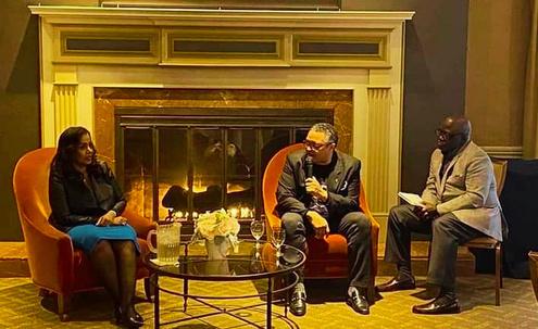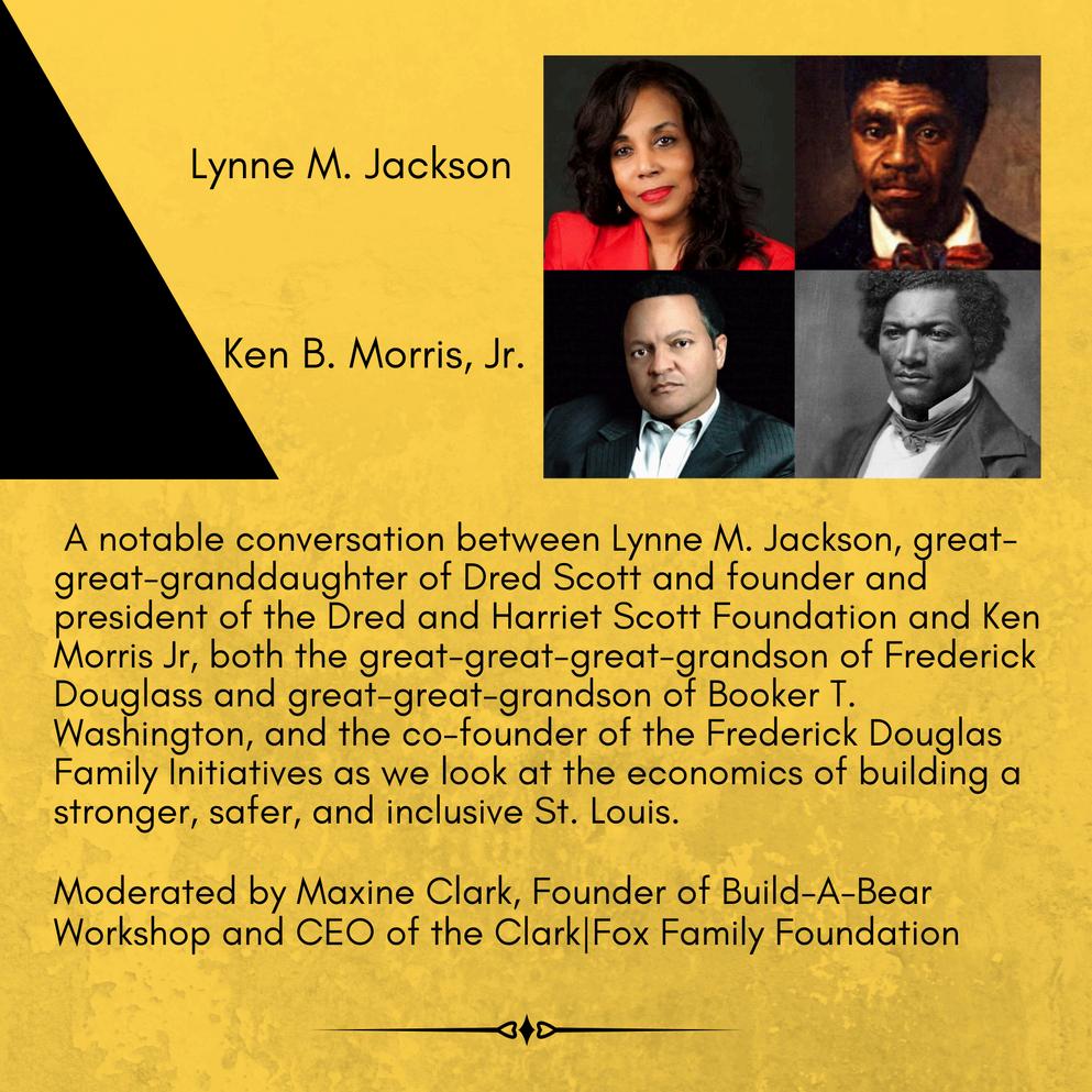 Breakfast and Lunch with History Lynne M Jackson and Ken Morris Jr descendants of Dred Scott and Frederick Douglass respectively, engaged in fireside chats following breakfast with Maxine Clark, founder and former CEO of Build a Bear Corporation and Benjamin Akande, following lunch with economist, professor, and former President of Westminster College Pictured here, luncheon chat with Ben Akande
