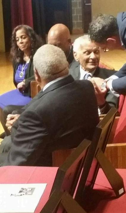 Author of Locking Up Our Own, Yale law professor, and keynote speaker, James Forman Jr greeting the Rev Dr C T Vivian while Dr Bernard Lafayette, Dr Terrence Roberts and Lynne Jackson look on at the King Chapel during The NYS at Morehouse College 2017