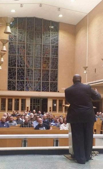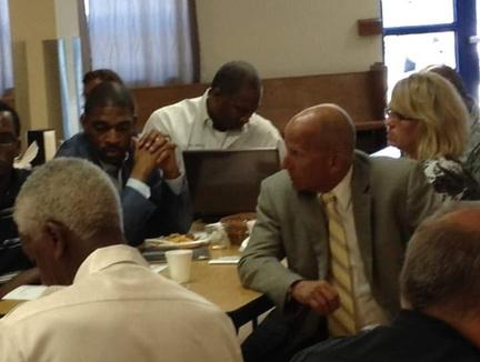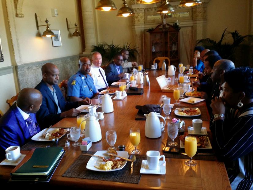 Two years before the Ferguson unrest, then Ferguson Police Chief Thomas Jackson and others attended The Ethics Project’s Police and Pastors Lunch for police in St. Louis City and St. Louis County. Starsky Wilson (seen with hands folded) subsequently became a member of the Ferguson Commission, and Lt Col Kenneth Gregory has since become St Louis County Chief