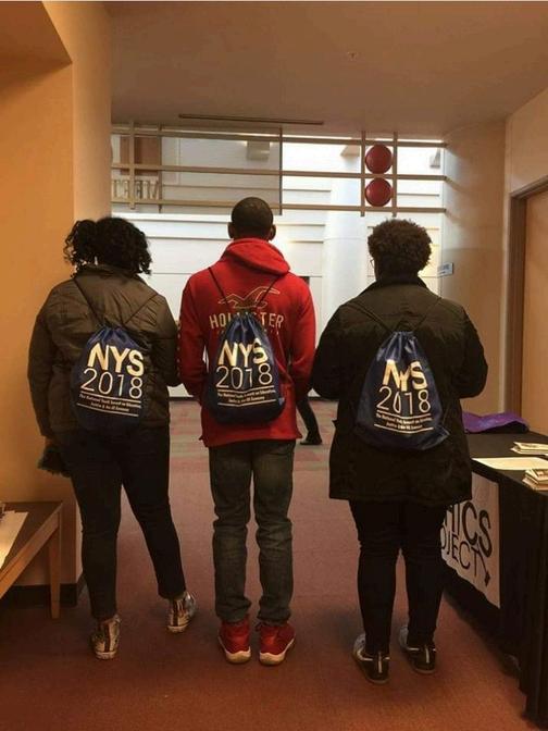 Student participants at The National Youth Summit at The University of Missouri St Louis wearing their conference back packs made possible by generous donors 2018 Photo