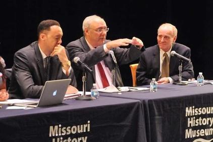 Former Chief Justice of the Missouri Supreme Court, Michael Wolff, addresses a packed crowed at the Missouri History Museum during The Ethics Project's program, Incarcerations in Black and White, an exploration of the racial disparities in the US criminal justice system Flanking Wolff is then TEP board chair, Redditt Hudson, and former Chief Judge of the Missouri Court of Appeals, James Dowd. 2013