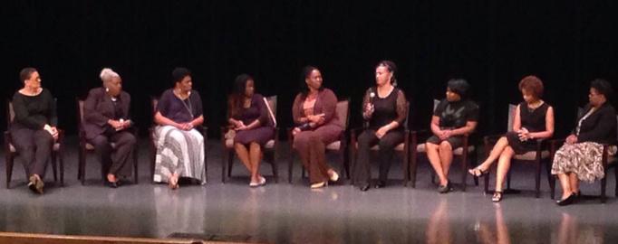 A distinguished panel of Black Mother’s speak to a pack house at the Missouri History Museum following the killing of Michael Brown in Ferguson, MO The effort continue for five years in over 30 venues From left to right, Dr Christi Griffin, moderator, Dr Marlowe Gaines, Rev Traci Blackmon, Riisa Rawlins, then Adjunct Faculty at Washington University, Law Professor Kimberly Norwood, Assata Henderson, Amy Hunter, Dr Leah Gunning Francis, and Emmy Award winning host, Carol Daniels Photo courtesy of Wiley Price