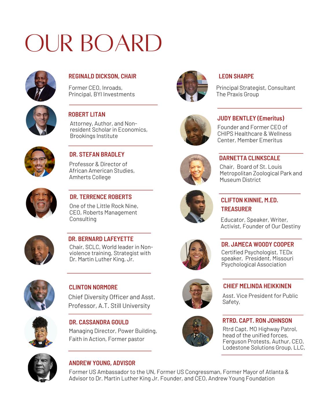 Jade Harrell, Donna Rogers Beard*, Angela Thames*, Marlo Gaines, Nadida Amatullah-Matin*, Muhammad Kamal, Rev. David Denoon, Tango Jackson, Rev. Dr. Leah Gunning Francis, Prof. Kimberly Norwood*, Nicholas Taggart-Long*, Carol Weir, Tom Schweitzer, Karon Bolden, Vicki C. Washington*, Julianne Malveaux, Tony Neal*, Capt Ron Johnson, Kevin Young, Dr Marva Robinson*, Kim Kraft*, Peggy Laramie* *donors