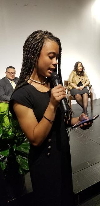 A Jackson Public High School student, flanked by Kenneth Morris Jr the greatgreat-great -grandson of Frederick Douglass and Lynne M Jackson, the greatgreat-granddaughter of Dred and Harriett Scott, introducing one of our civil right legends at the 2019 National Youth Summit in Jackson, MS