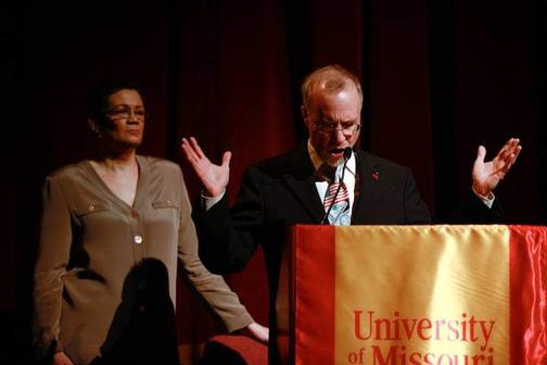 Tom George, then Chancellor of the University of Missouri St Louis, welcoming 1500 students to the first regional youth summit at the Touhill Performing Arts Center in St Louis Dr Christi Griffin stands to his right 2011 Photo credit Suzy Gorman (SuzyGorman.com)