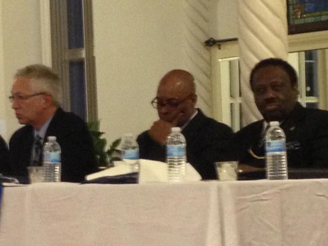One of the many townhall meetings held during Ferguson to address issues plaguing the region Seen here, the late Professor Rick Rosenfeld, then Judge Jimmie Edwards, and educator and pastor, Bishop Lawrence Wooten