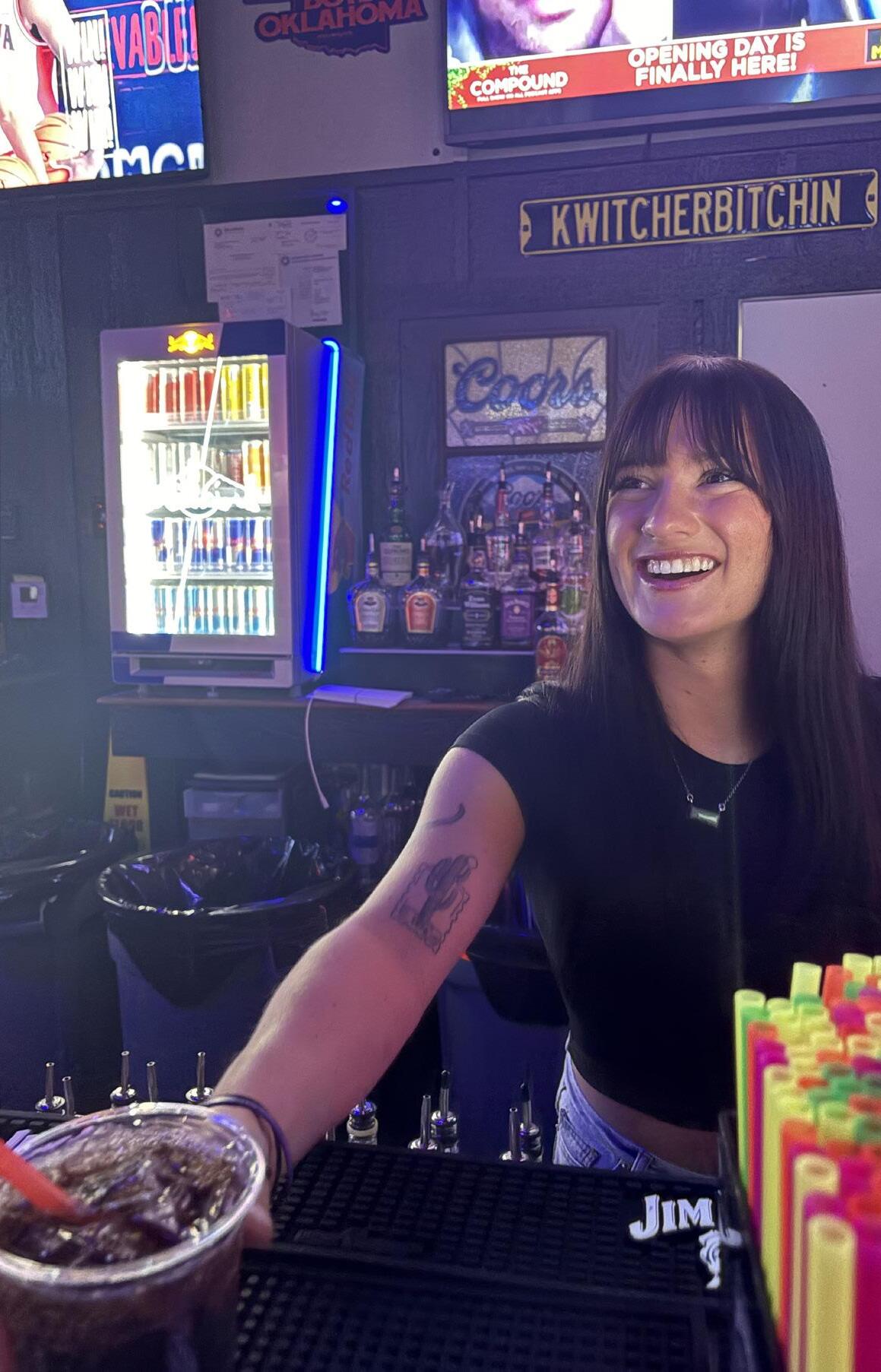 Underneath neon lights and blaring country music, Frankie Bradshaw pours vodka and repeats in her head the next four drinks she needs to serve.