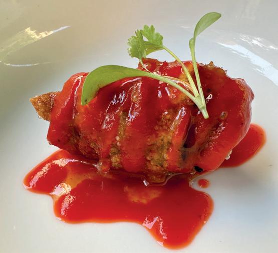 The green gazpacho with cucumber, kale and avo cado is the perfect tonic to a blistering day. Literal ly served on a bed of ice, the crunchy kale makes it a surefire winner. I also loved the soft shell crab tempura with yuzu ponzu dress ing, a very wel come addition to the coast.