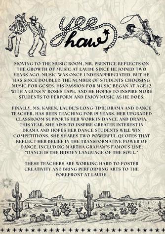 For starters it had its own name ‘Wild West’ and kept a western cowboy feel throughout. The front page strap: ‘Sports/Scandals/Movies, etc’ was the only one that teased up what was on offer inside. It had a good use of puns and alliteration right from the start and the mix of ideas was impressive. The food truck article with its cliffhanger question at the end was funny, the interview of teacher Mr McCann was the best of the magazines and the chat with new teacher Miss Leesley was really interesting. Both the artwork section and, particularly, its cartoons deserve a mention.