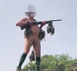 The man is shown wearing just boots, socks and gloves, and brandishing a shotgun. From the weapon are hung a number of dead partridges, as well as one hanging from his err, other weapon.