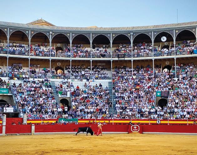 Friends and families greet one another with familiar warmth, drinking tall glasses of Tinto de Verano and icecold Alhambra beer, waiting for the doors to open and the show to begin. Amidst the city’s bustling streets and Moorish architecture, lies the epicentre of Andalucian tradition and controversy: a circular 20,000-seater redbrick amphitheatre where the Feria de Corpus Christi bullfights take place each year in June.