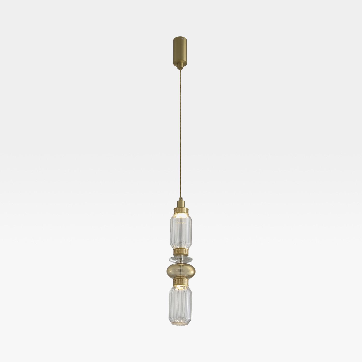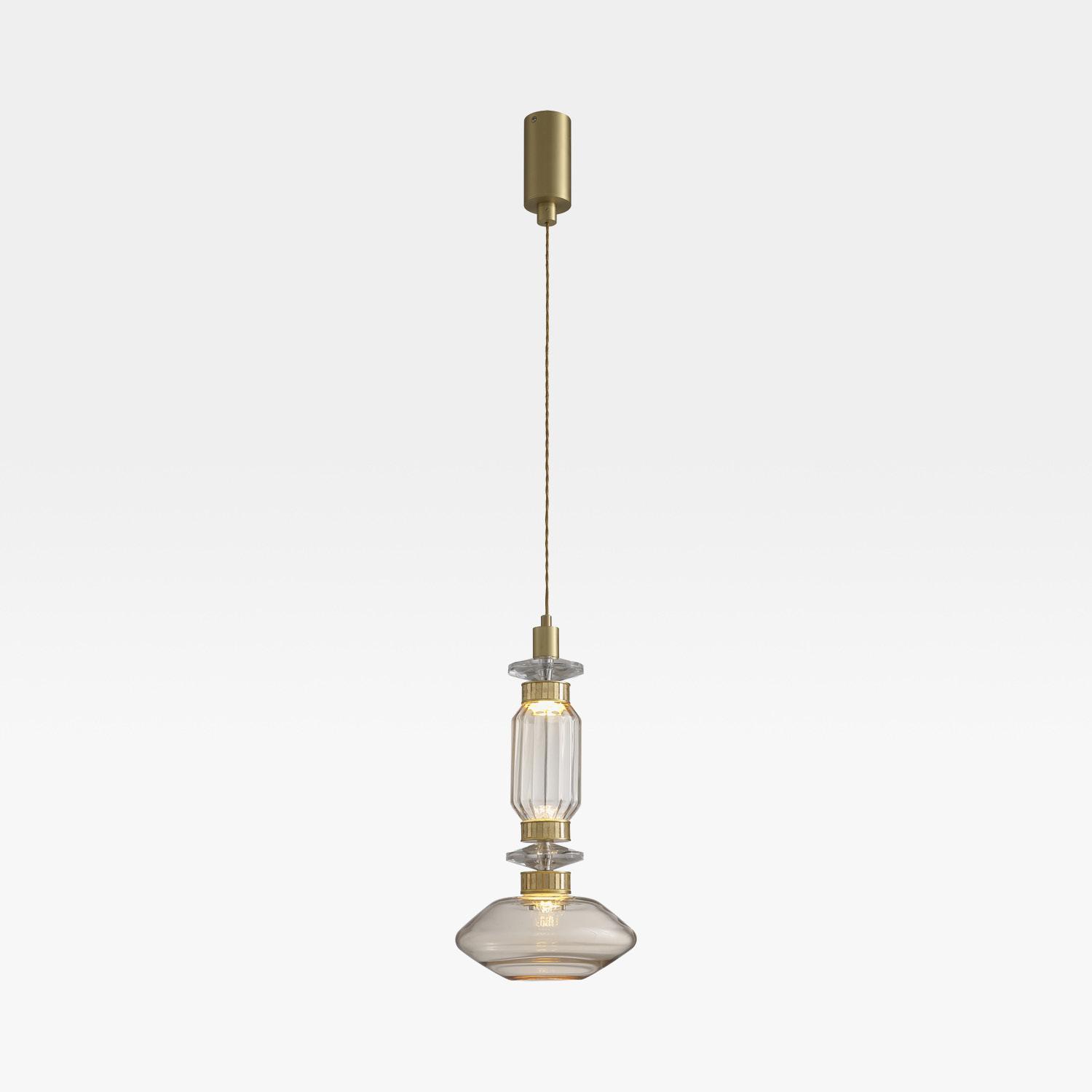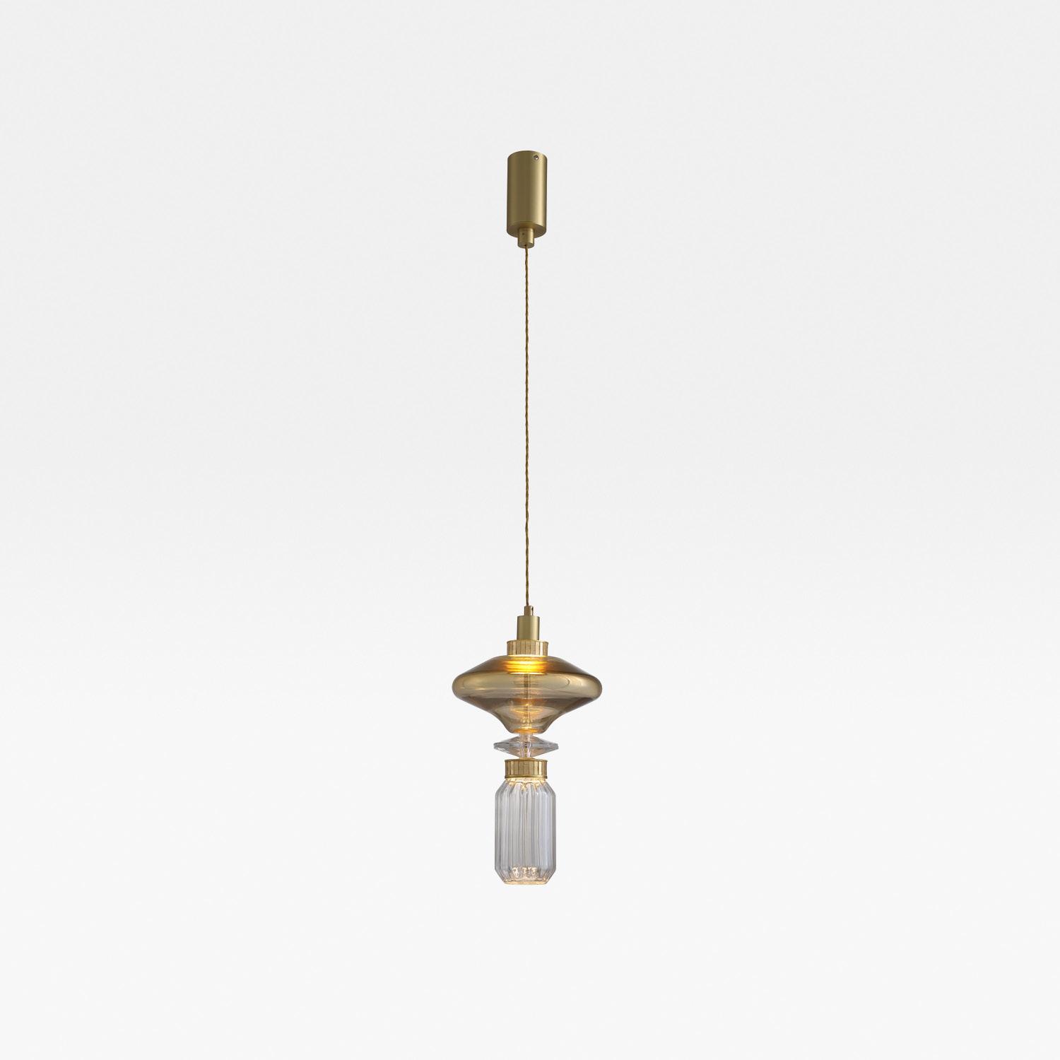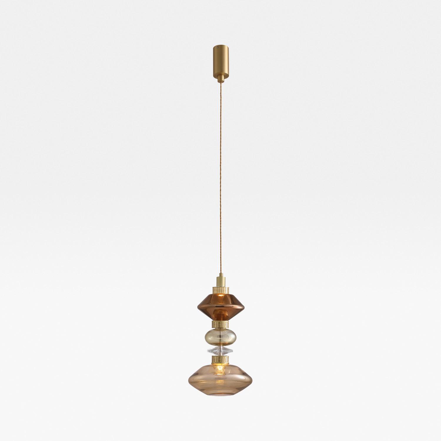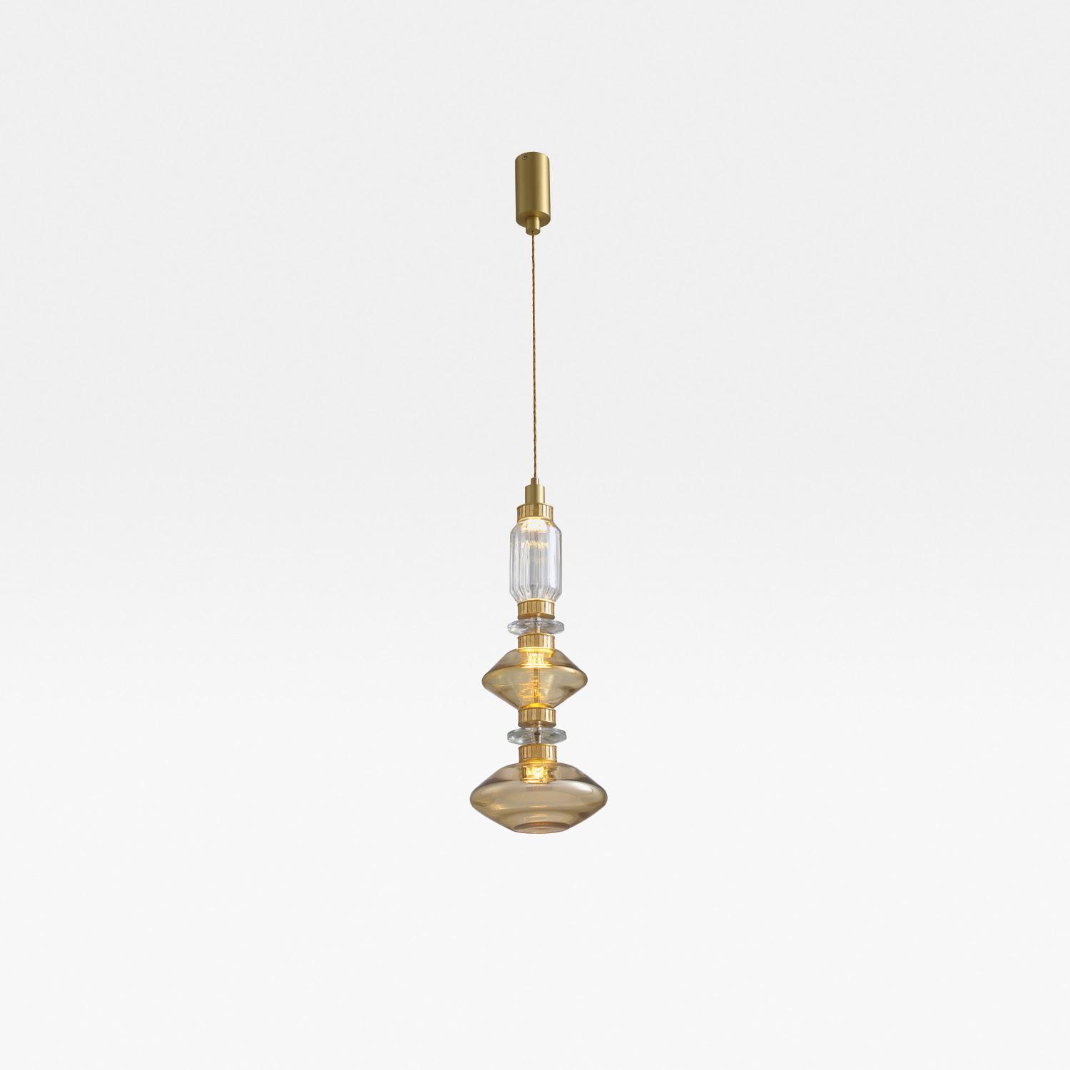 The Asterope Pendant rises in a graceful vertical silhouette, adorned with bronze and translucent reddish-clear accents. When lit, it casts a warm, radiant glow that feels both exotic and timeless.