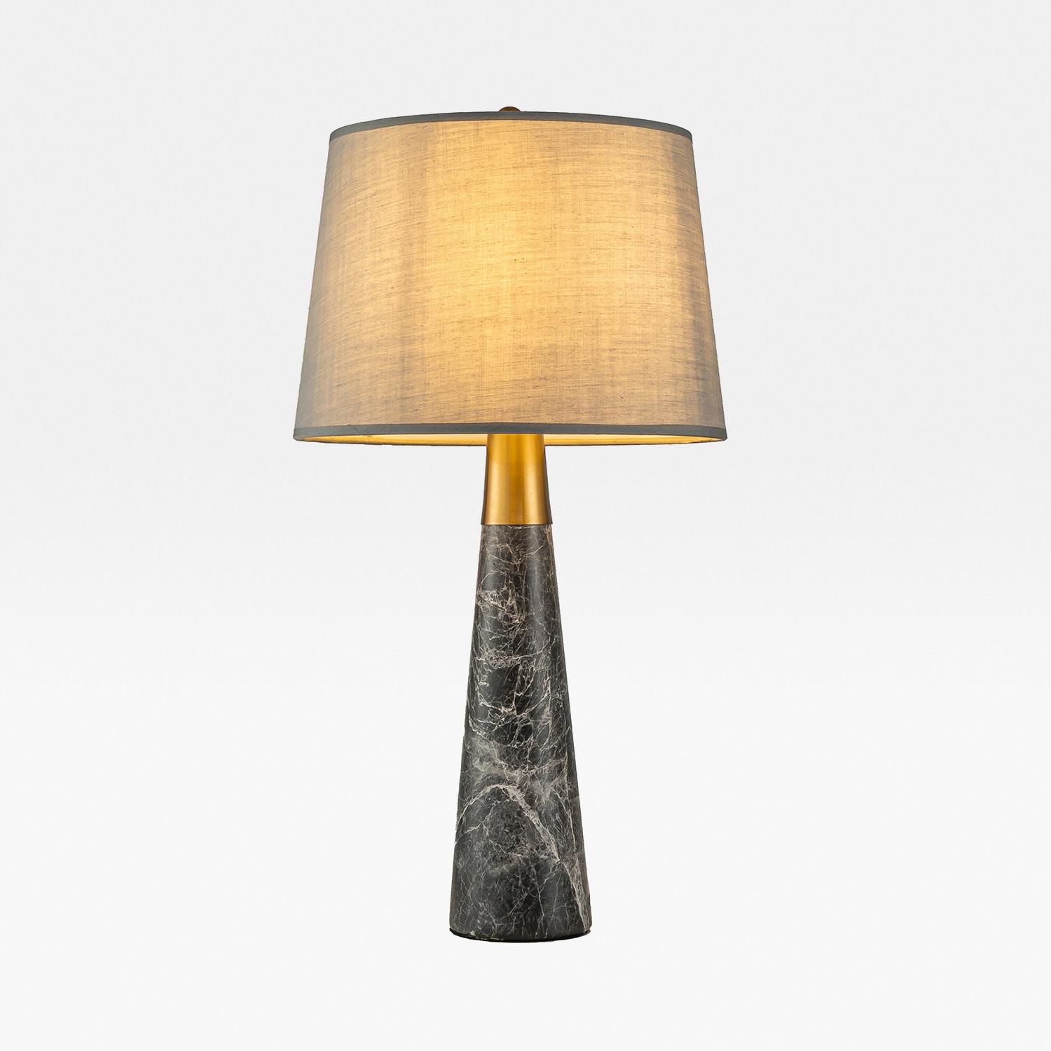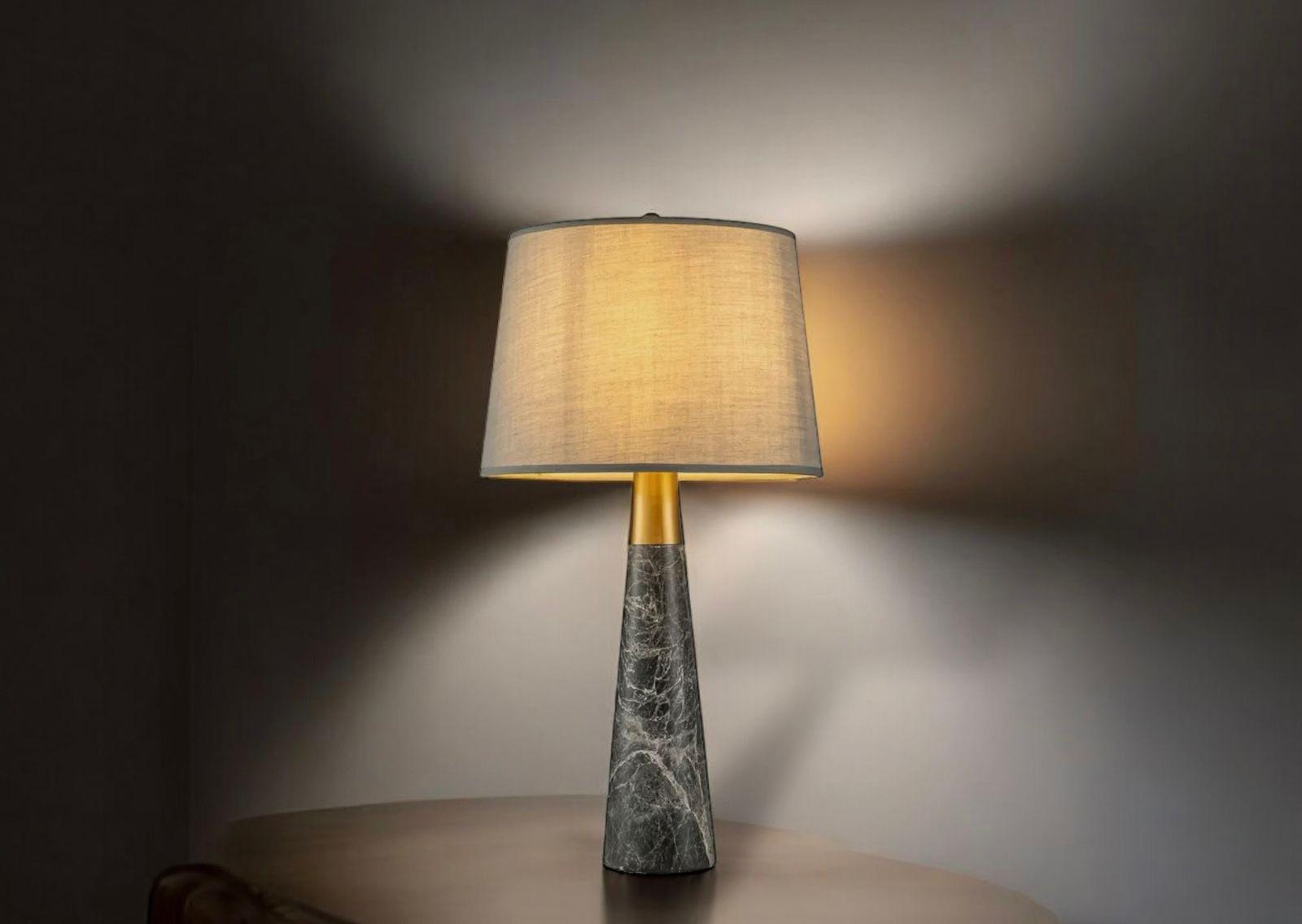 The Valencia Lamp features a deep, dark marble base with gleaming gold accents. Its bold contrast blends modern sophistication with timeless elegance.