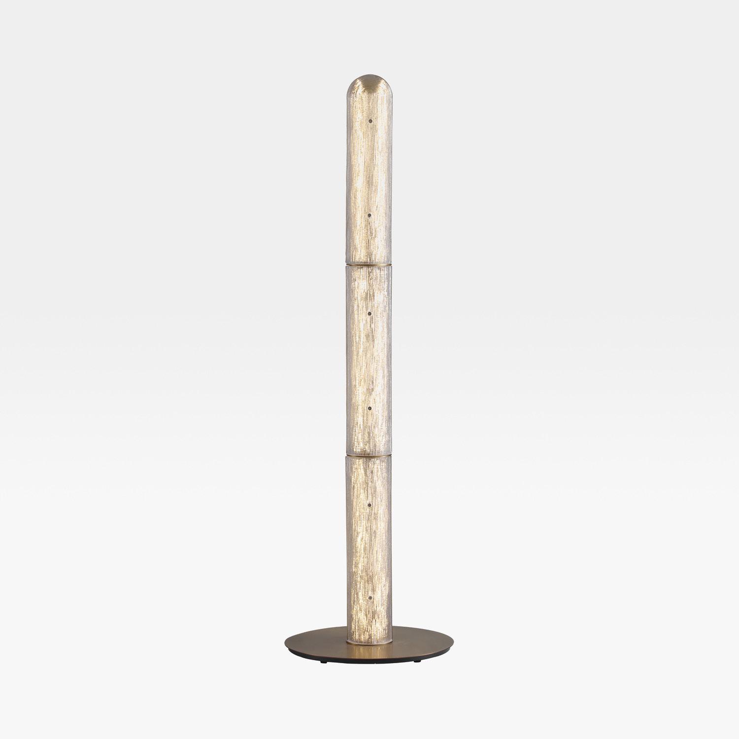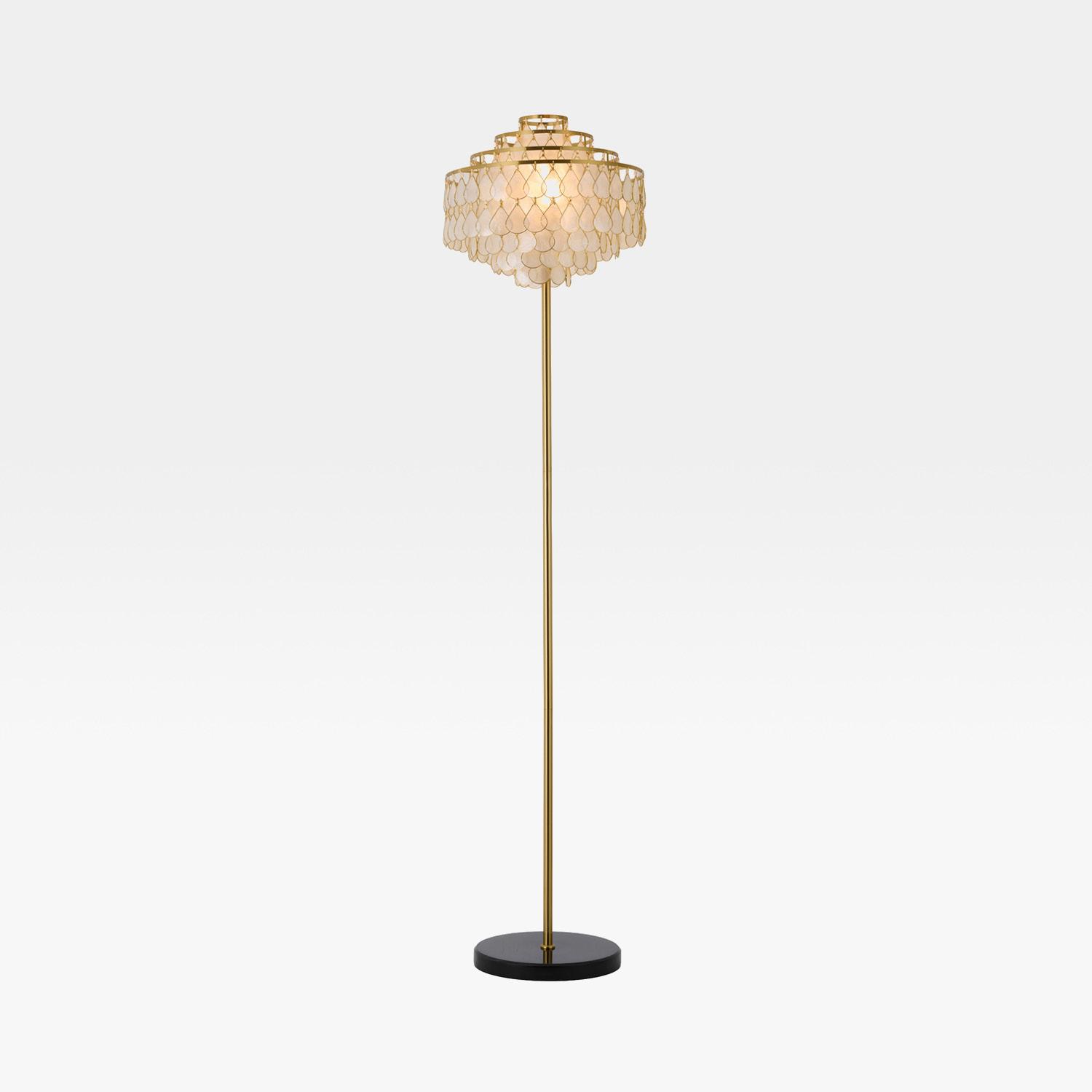 The Matera Floor Lamp is tall and elegant, with refined gold accents and intricate details. Its sculptural form makes a striking statement.