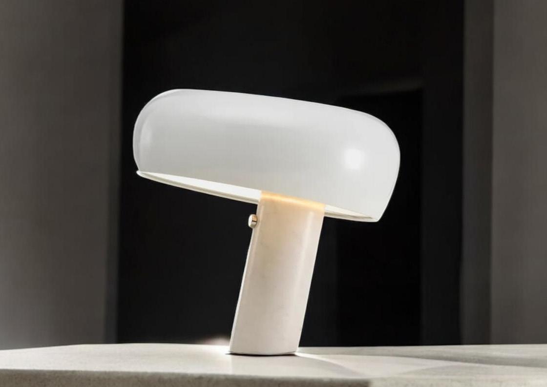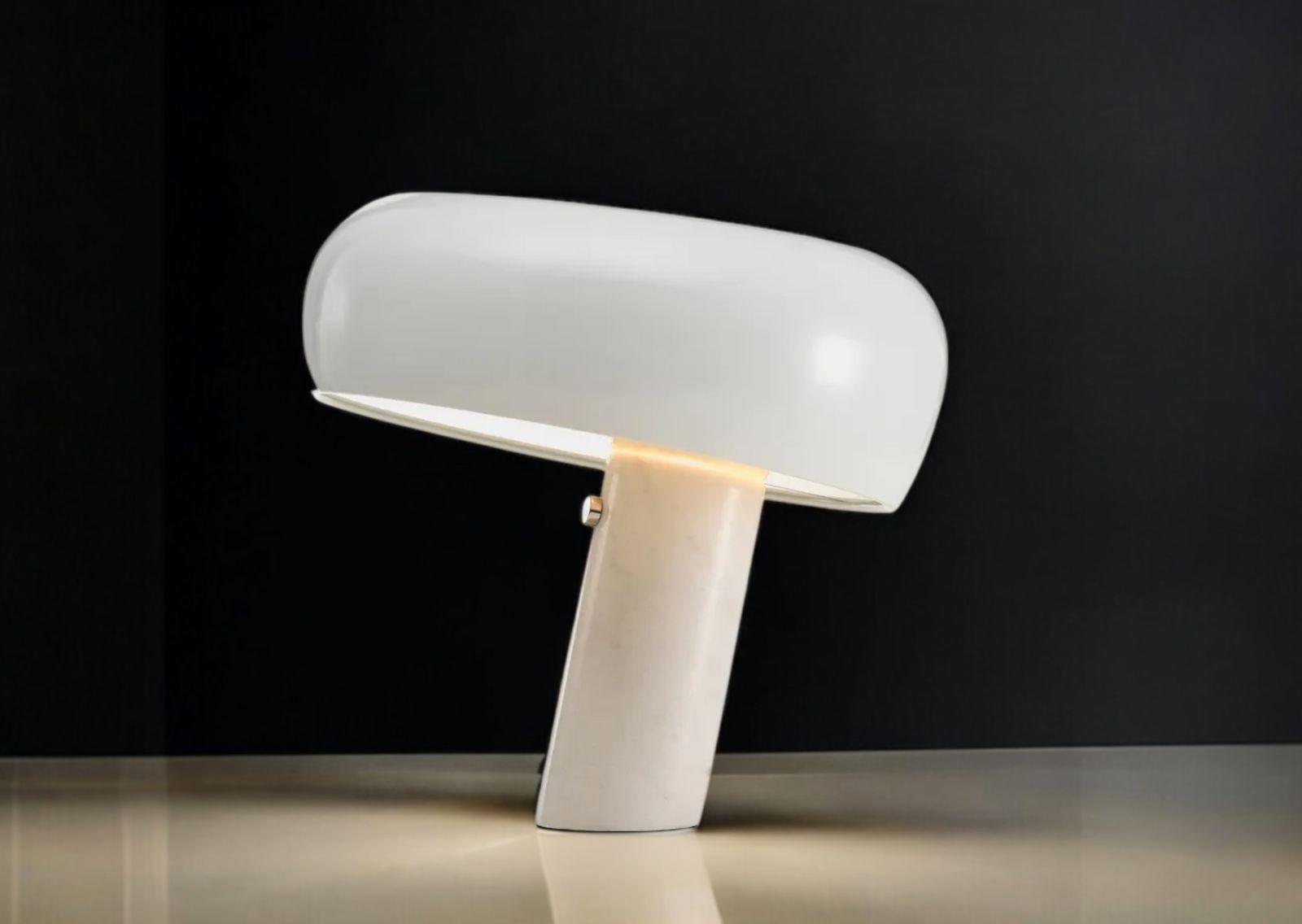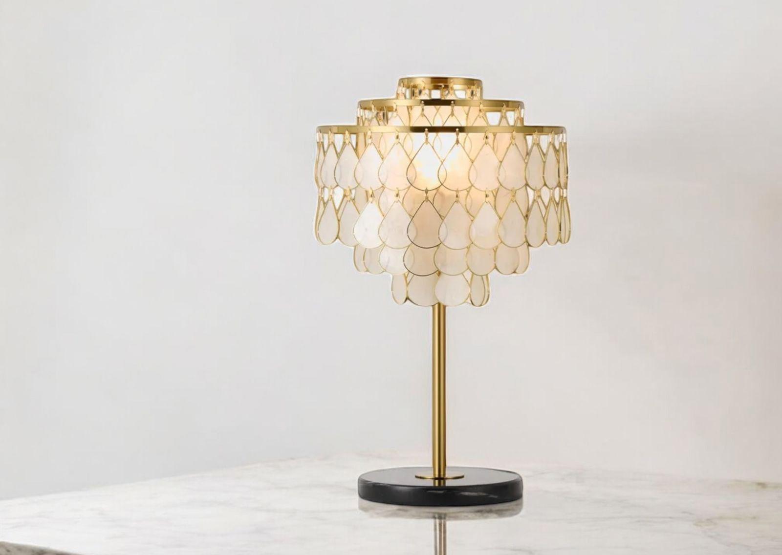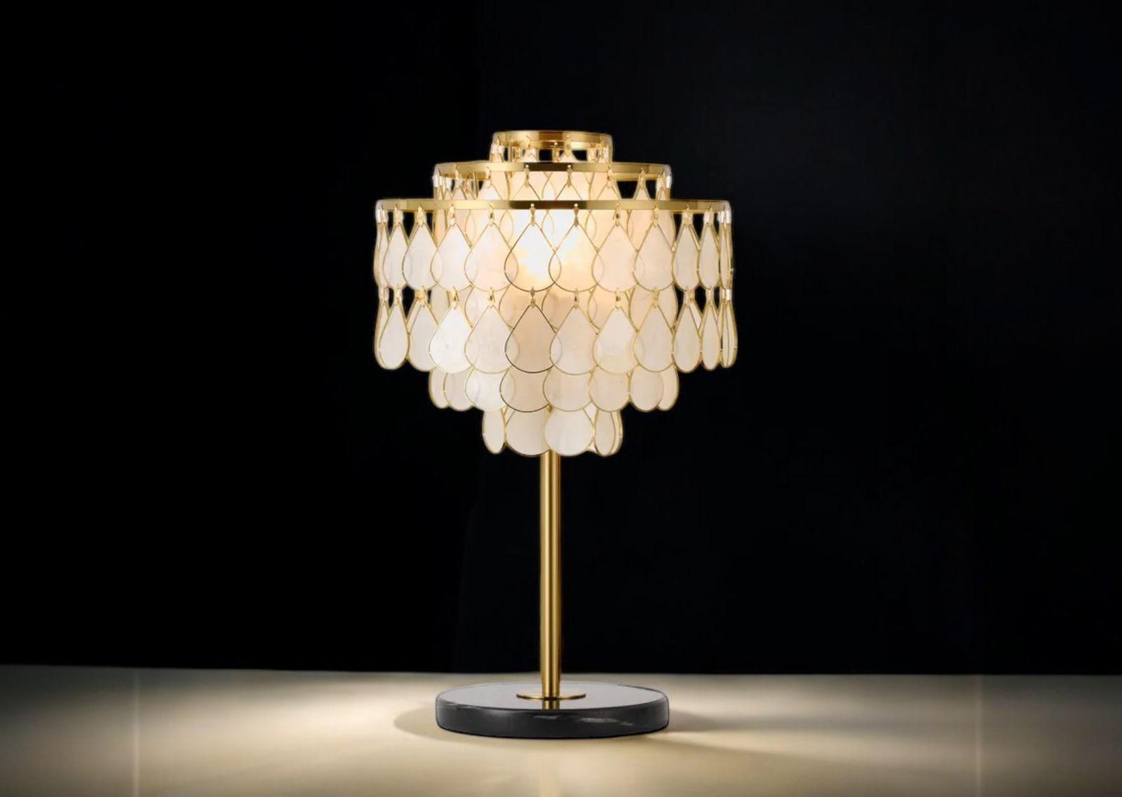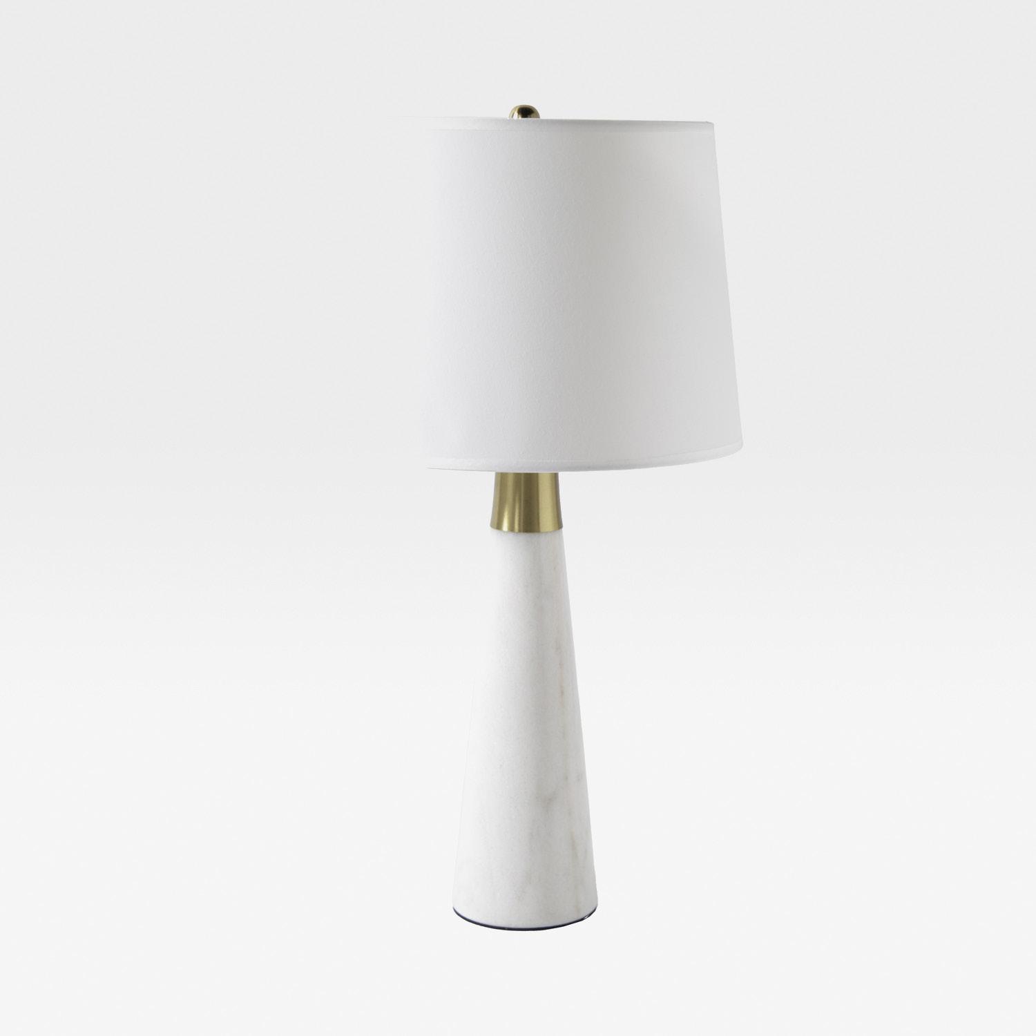 The Valencia Lamp has a sleek white marble base with gold accents, balancing elegance and modern design.