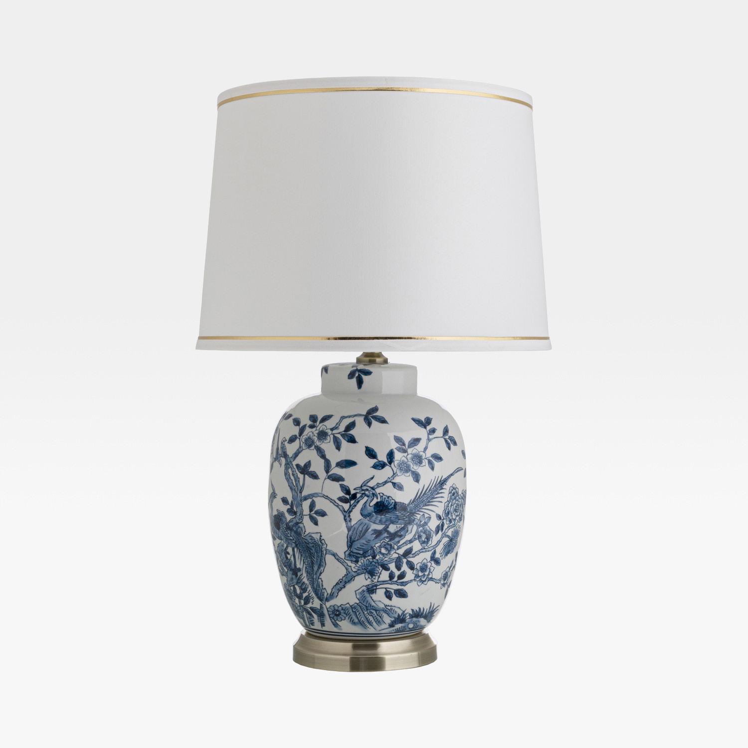 An oversized table lamp with a soft, rounded silhouette. Its surface features an elegant dark blue illustration, adding depth and character.