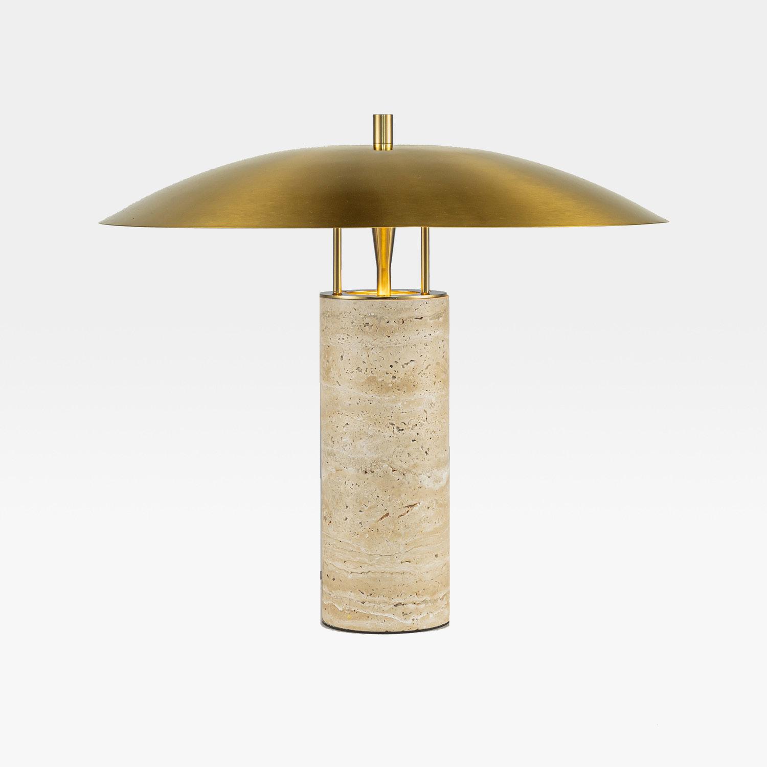 This lamp combines a travertine base with a gold top, blending traditional and modern elements. It radiates warmth and timeless elegance. NAME