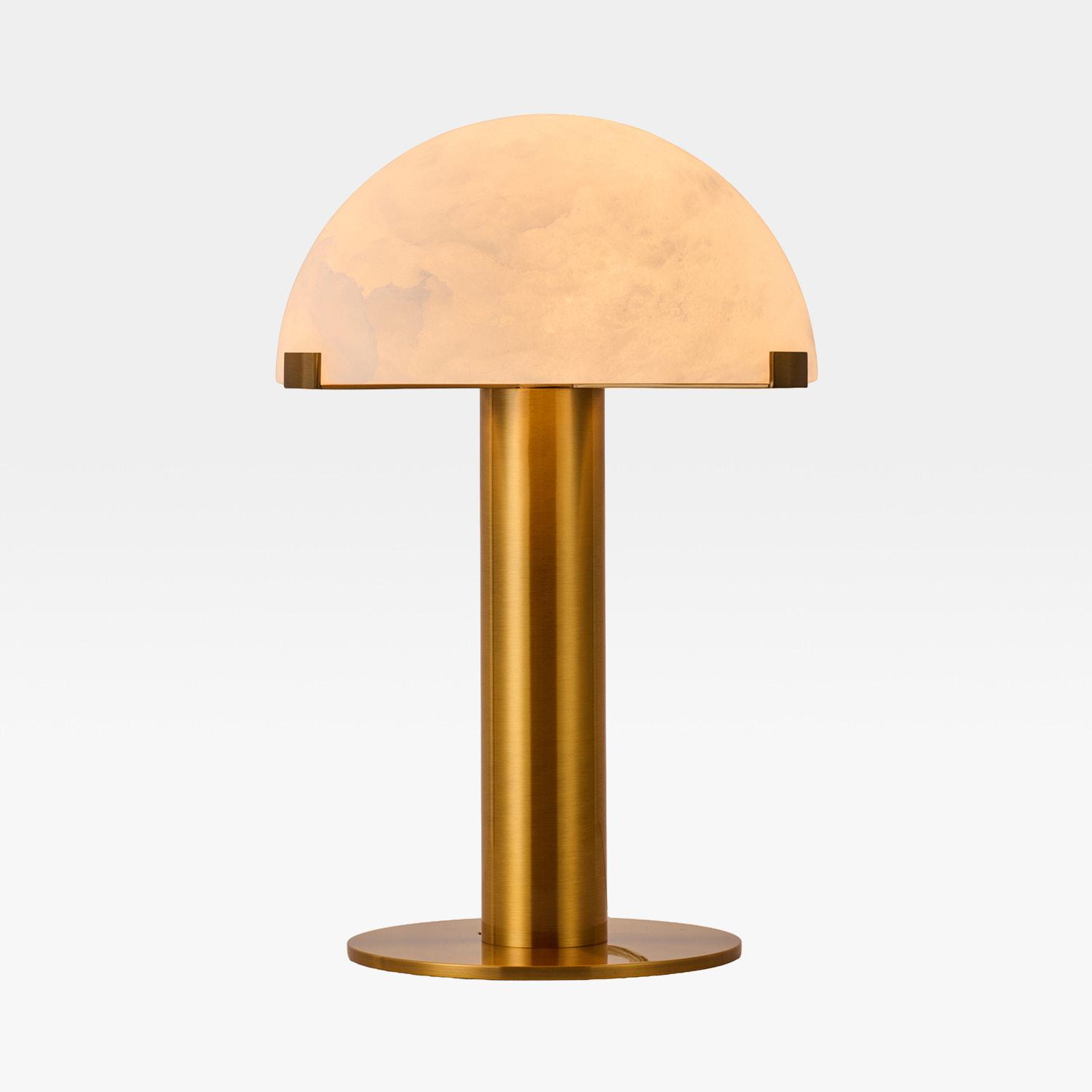 The Vitoria Table Lamp has a gold base and alabaster top. It glows warmly, exuding elegance and timeless luxury.