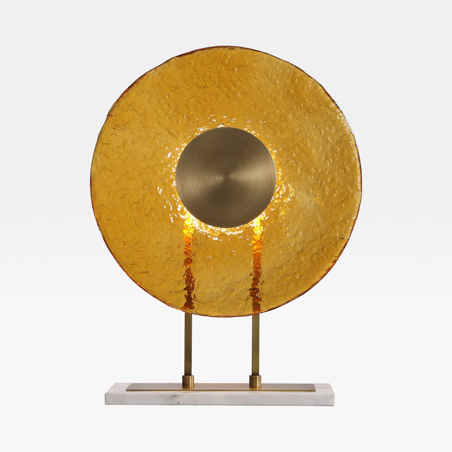 The Gleaming Table Lamp has a warm, circular form with gold accents. Its unique shape adds style and ambient light to any space.