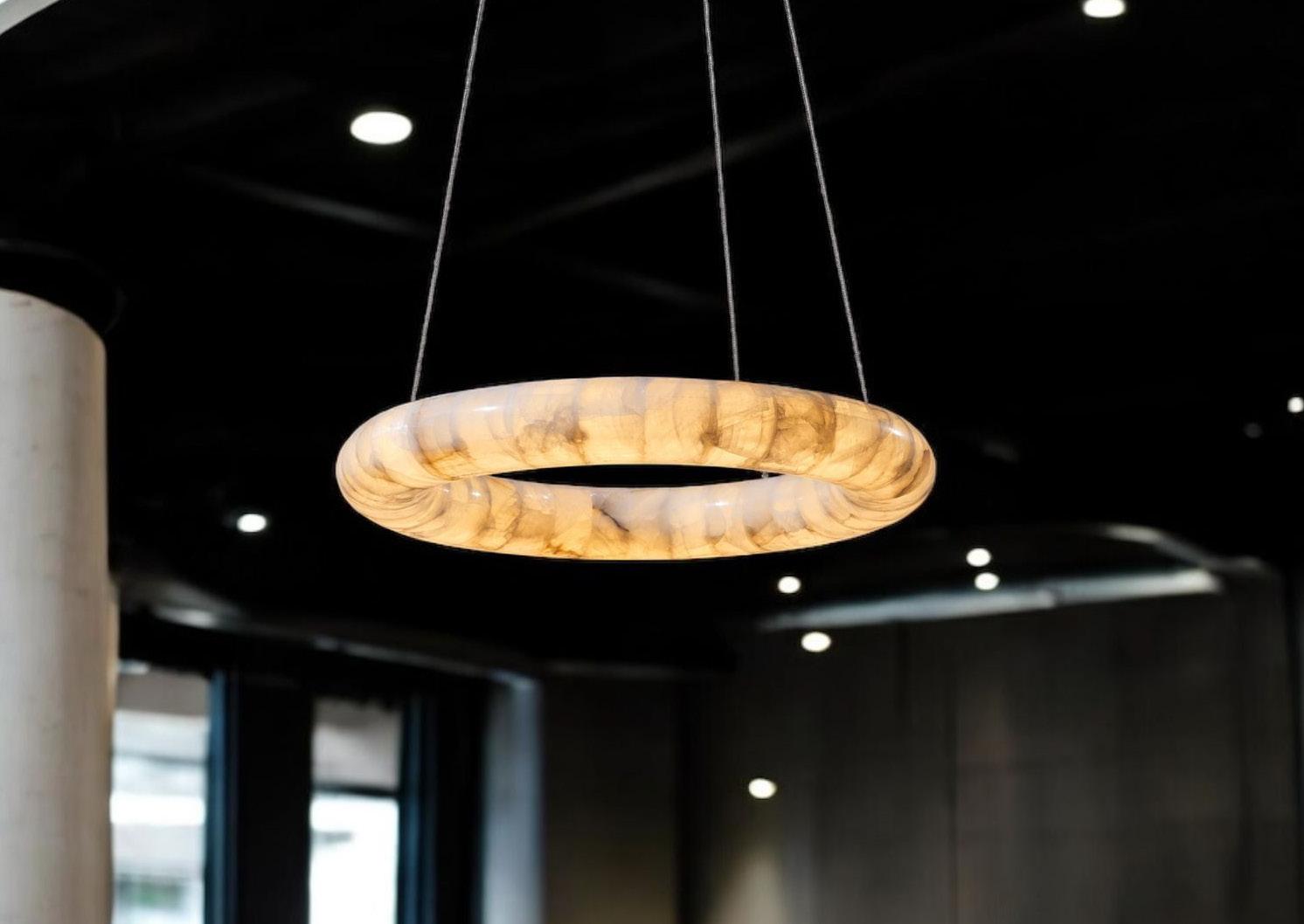 This alabaster light features a smooth, circular ring design. When lit, it emits a soft, warm glow, creating an elegant and inviting atmosphere.