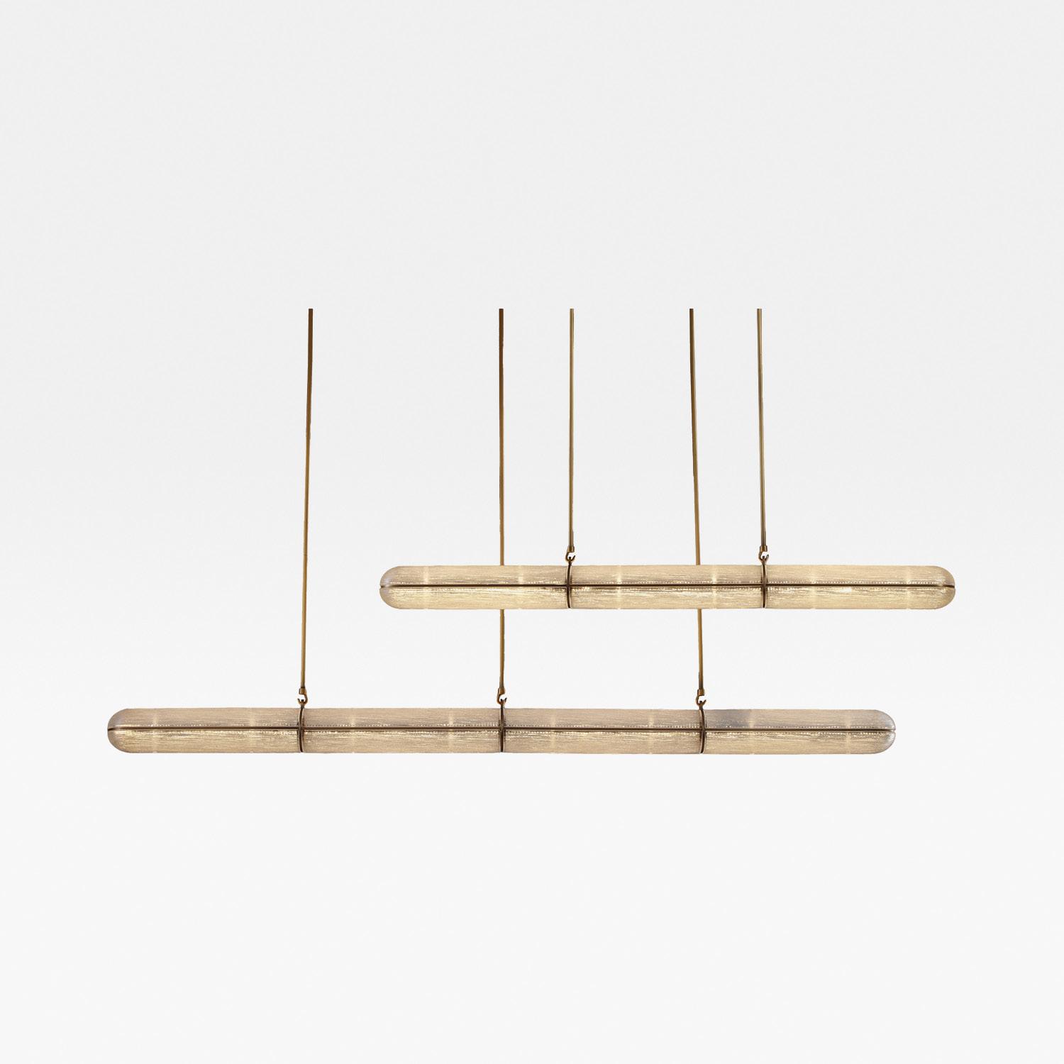 This chandelier features a sleek, horizontal design with a refined textured finish. Its elegant form creates a striking focal point, adding warmth and style to any space. NAME